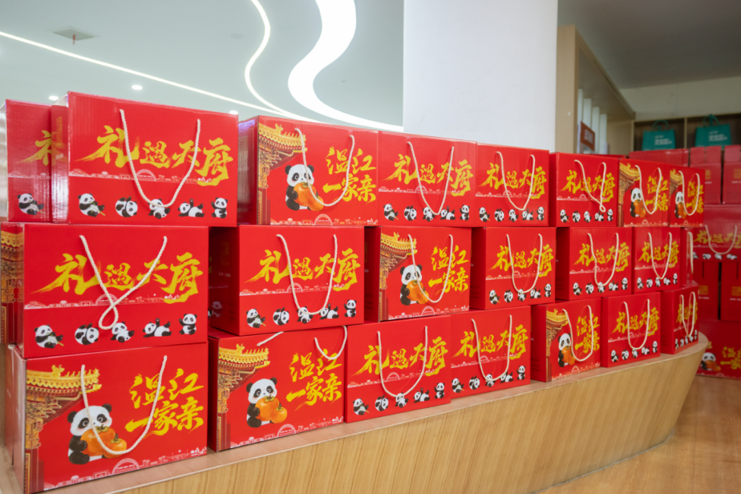一箱箱印有“温江一家亲”的红色礼盒