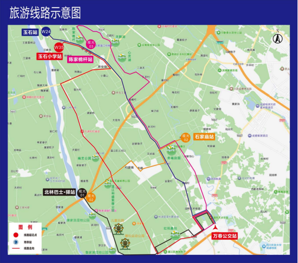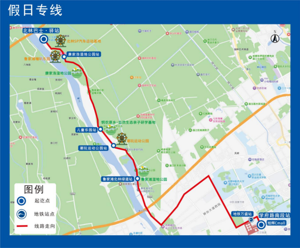 途经站点:学府路南段站、地铁万盛站、鲁家滩北林绿道站、潮玩运动公园站、儿童乐园站、康家浩湿地公园站、北林巴士·驿站