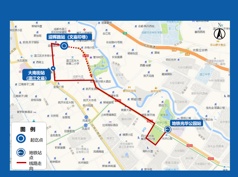 途径站点:地铁光华公园站(H口)、大南街站(温江文庙)、迎晖路站(文庙印巷)