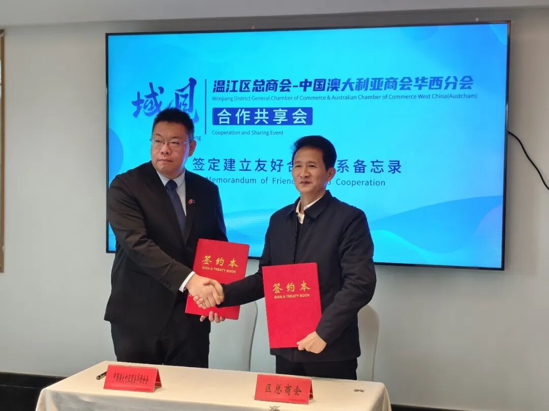 现场,区总商会与中国澳大利亚商会华西分会签订了《友好合作关系备忘录》。双方将以资源整合为纽带,推动全球优质资源与温江重点产业精准匹配,不断拓展合作网络,既助力两地企业共同开拓国际市场,也为温江导入更多澳大利亚优质产业项目,最终实现双向赋能、共赢发展。