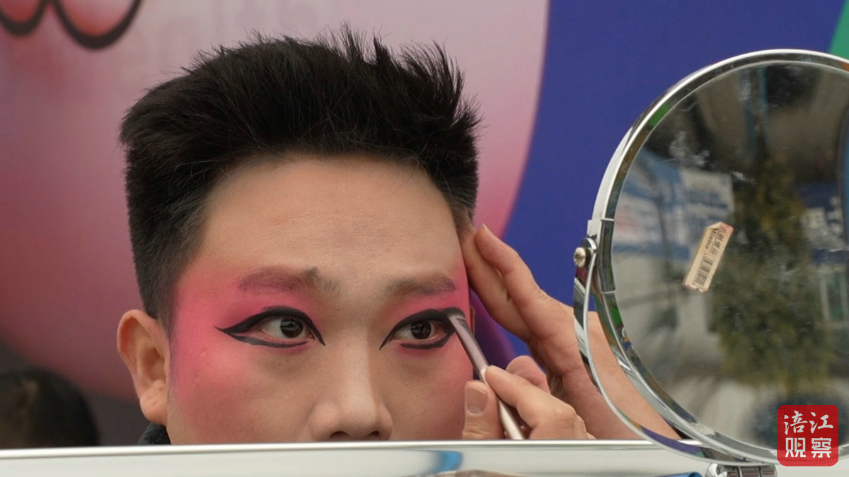 早上七点,天色还未完全亮透,绵阳川剧演员桂豪杰已坐在镜前。31岁的他用小拇指蘸取油彩,沿着眼眶细细勾勒——这是川剧脸谱的第一笔,也是他今天“奔春”之旅的开始。
