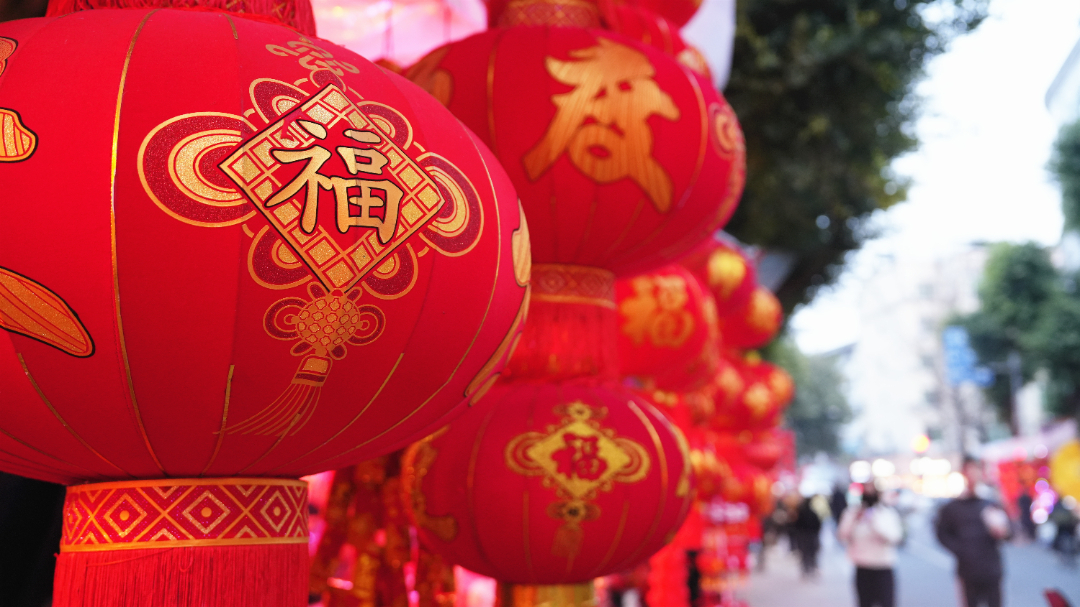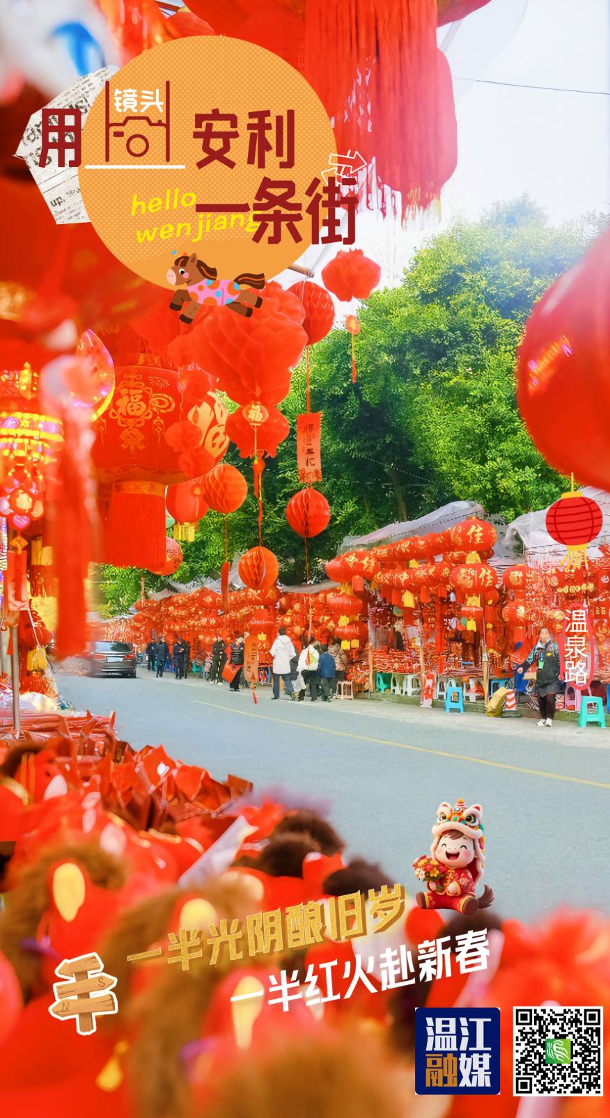 温泉路又称“半边街”,这条长约400米的街巷,紧邻城南古郭城墙,是温江人的“年货第一街”。对于温江人而言,温泉路不是一条普通的老街,而是刻在骨子里的新春印记,是承载团圆期盼的烟火之地。每逢新春临近,这里便会呈现出一年一度的“半边街红”。走进温泉路,目之所及皆是热烈的红:成串的红灯笼高高悬挂,“福” 字灯笼、吉祥挂饰层层叠叠......