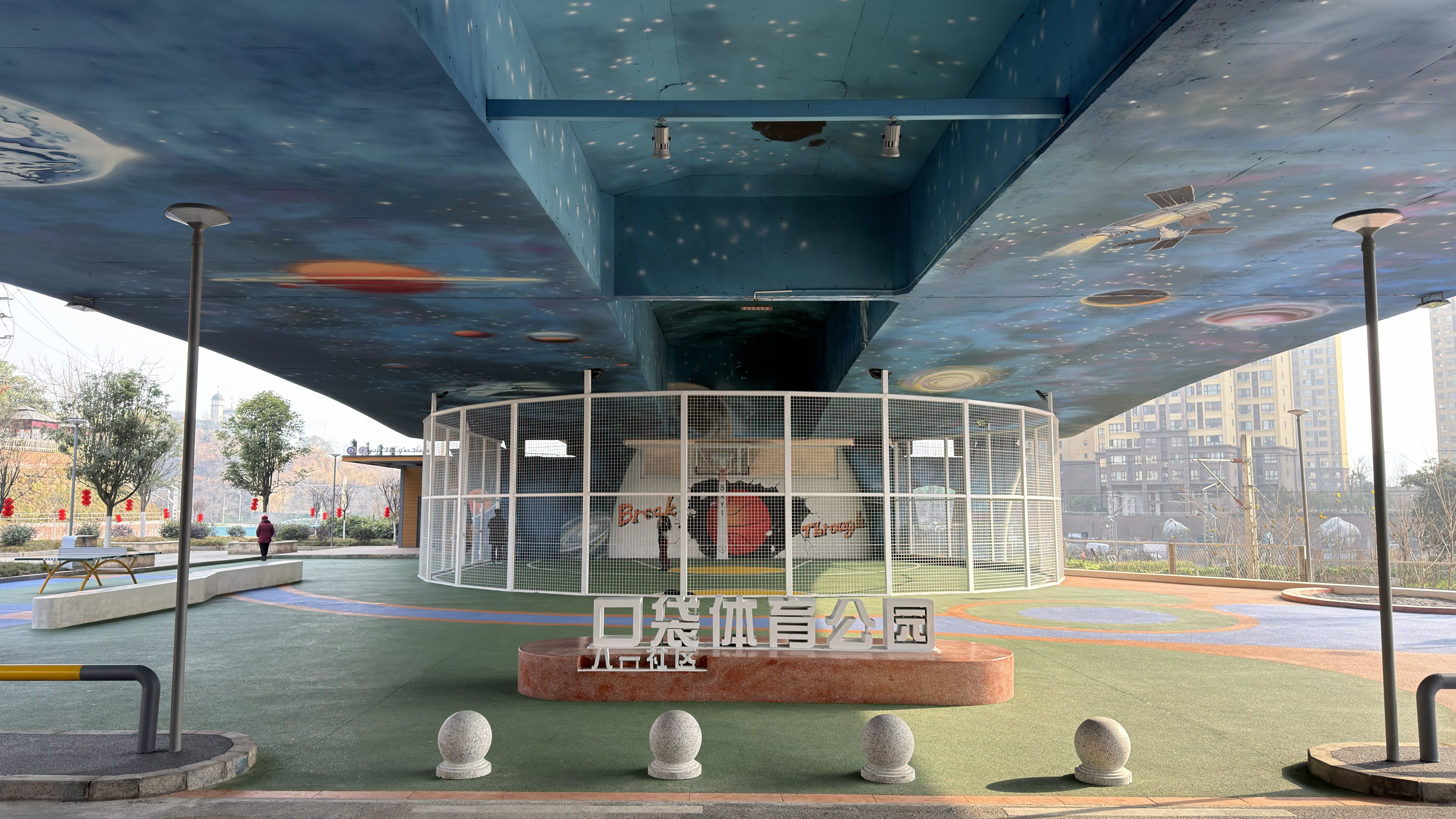 公园虽“口袋”大小,功能却十分齐全:2张乒乓球桌、1个三人制标准篮球场、1组体育锻炼健身器械,满足了全年龄段居民的运动需求。结合社区内两所学校的区位特点,公园还打造了“悦读空间”,成为学生和居民就近阅读、交流的“文化驿站”。