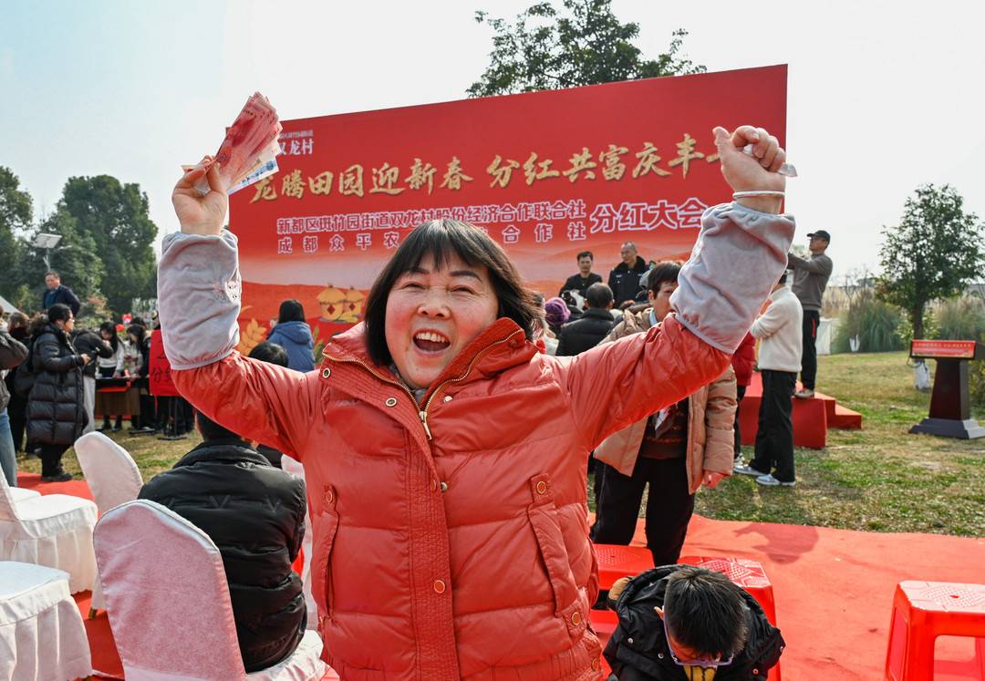 2月4日,成都市新都区斑竹园街道双龙村漫野音乐营地的草坪上,双龙村2026年分红大会正式开始。大红的对联、喜庆的福字、欢快的音乐、热闹的游戏,还有堆成小山的40余万元现金,让整个村子的村民脸上都洋溢着喜色。