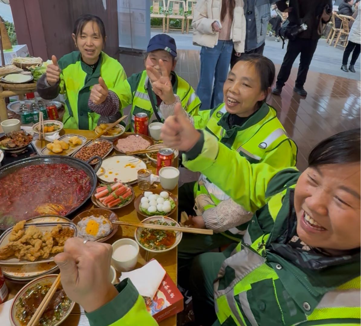 “怕耽误大家时间。”她朴实地笑着,“第一次参加这样的团年饭,不敢相信社区还会请我们,感觉到自己备受尊重。”刘大姐负责的路段商铺多、人流大,每天天不亮就开始工作。今年春节,她也选择留守岗位,“街道干净了,大家过年才舒心。”