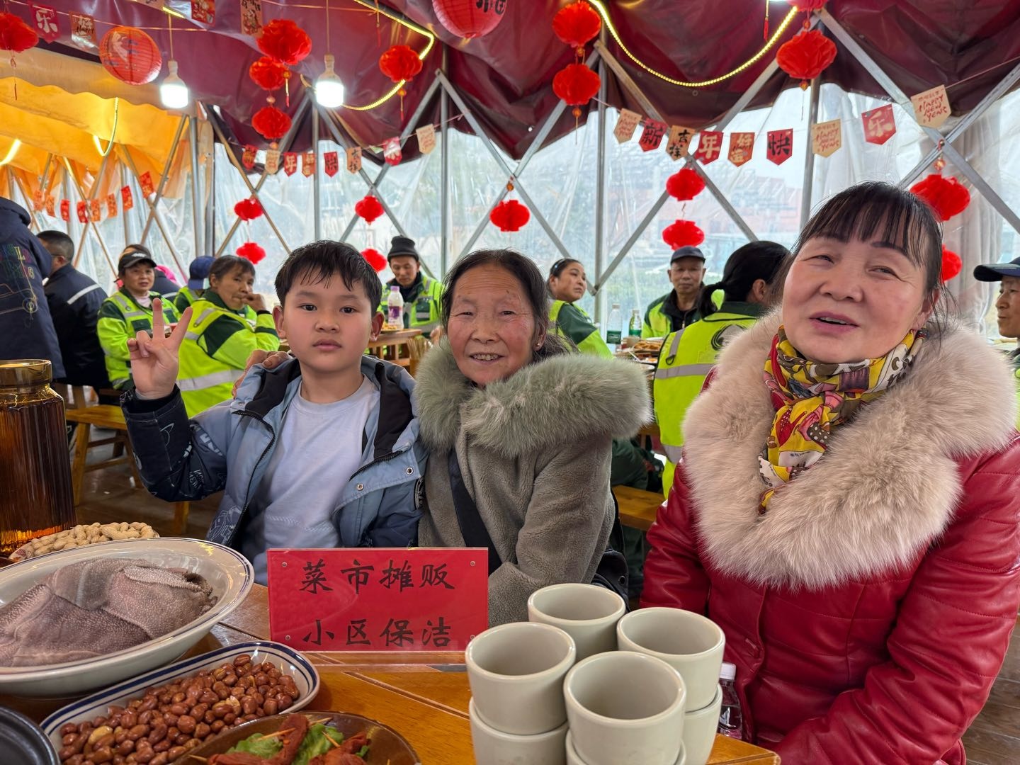 任大姐是怡福社区208号院的小区保洁,今天她特意带来了自己的小孙子。孩子好奇地打量着热闹的场面,任大姐则忙着给同桌的“家人”夹菜。