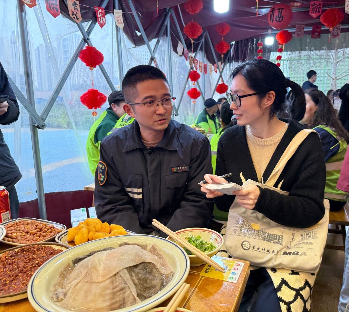 2月6日晚,成都市成华区府青路街道怡福社区的一家火锅店棚内,灯笼高挂,彩灯闪烁。一场名为“怡家宴·团年饭”的活动正在这里温暖开席。