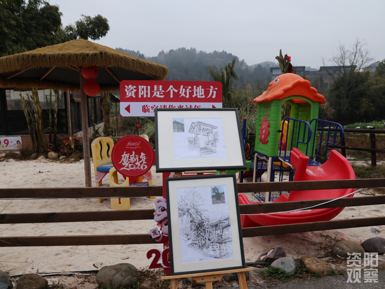电瓶车绕四川音乐学院成都美术学院半圈,红碑村便出现在眼前——田间油菜花冒出早春第一抹鹅黄,500米村道披满红妆,田野里的艺术装置错落点缀。刚进村,浓浓的年味便裹着文艺气息扑面而来。