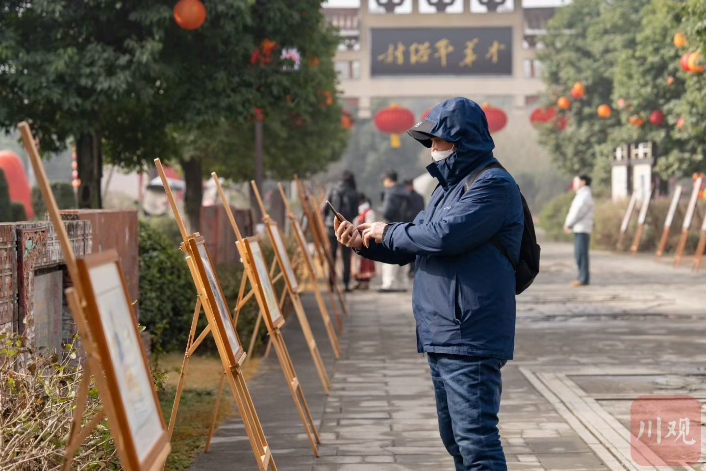 游客在绵竹市孝德镇年俗村欣赏年画作品