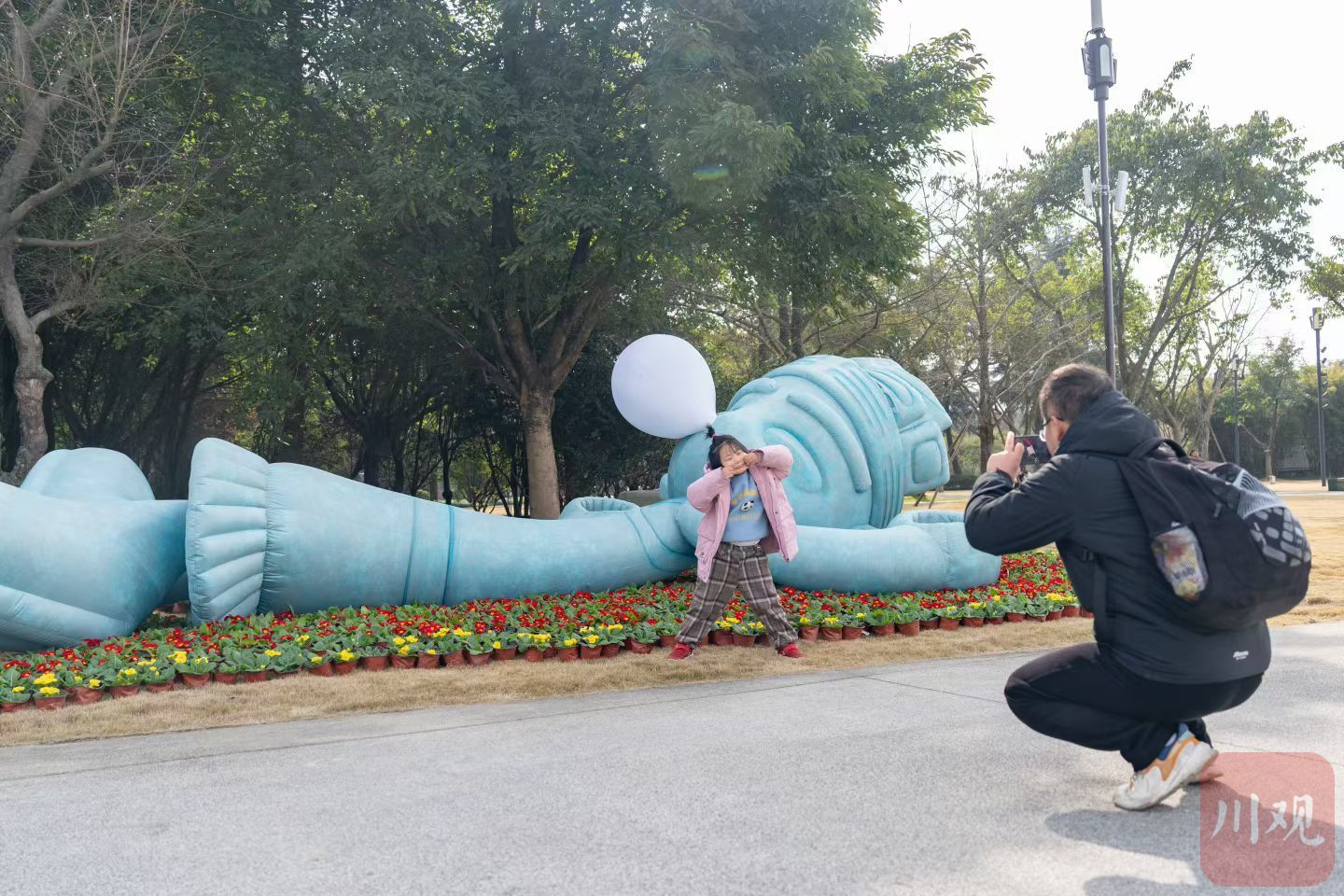 游客在三星堆博物馆拍照留念