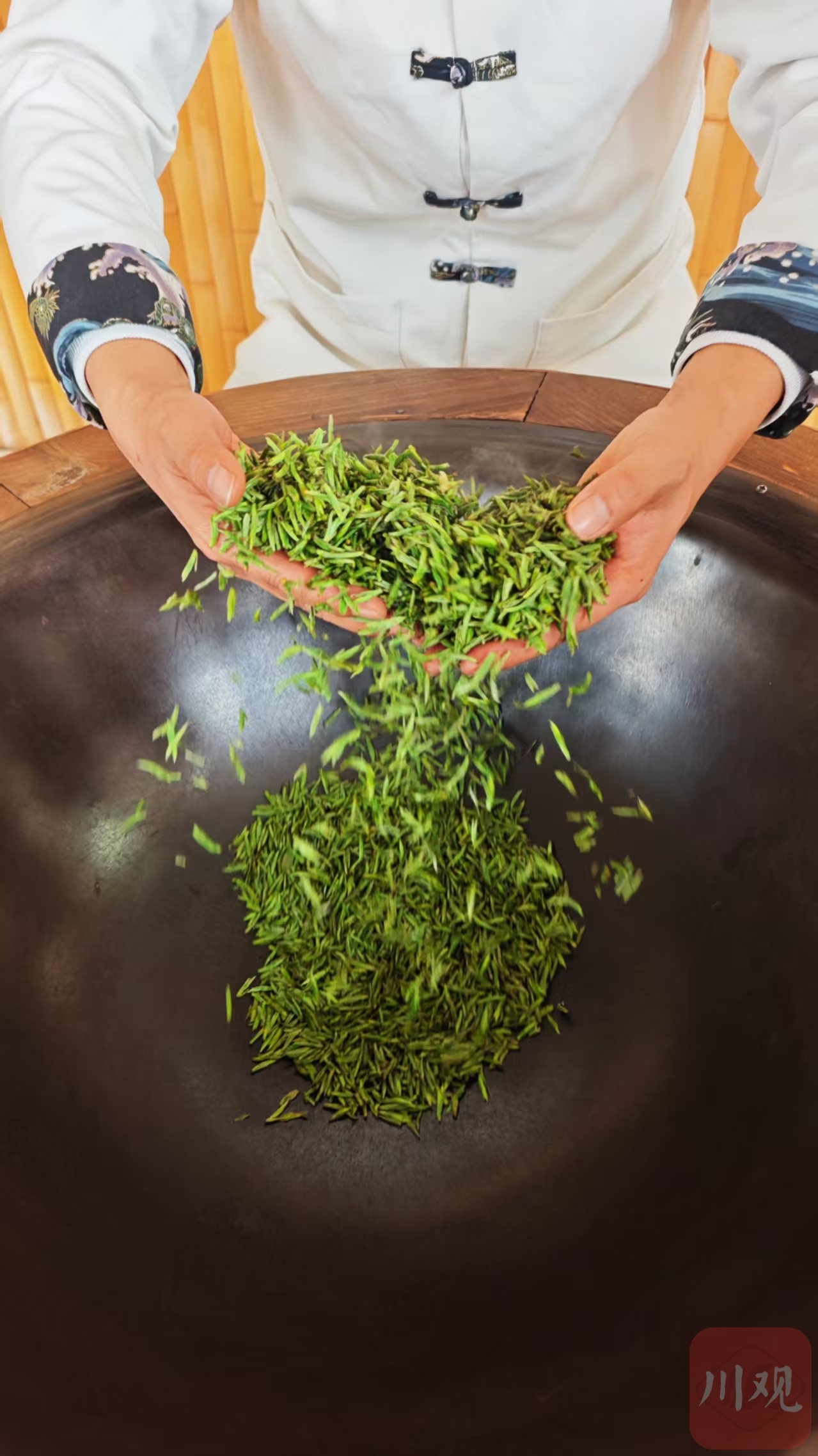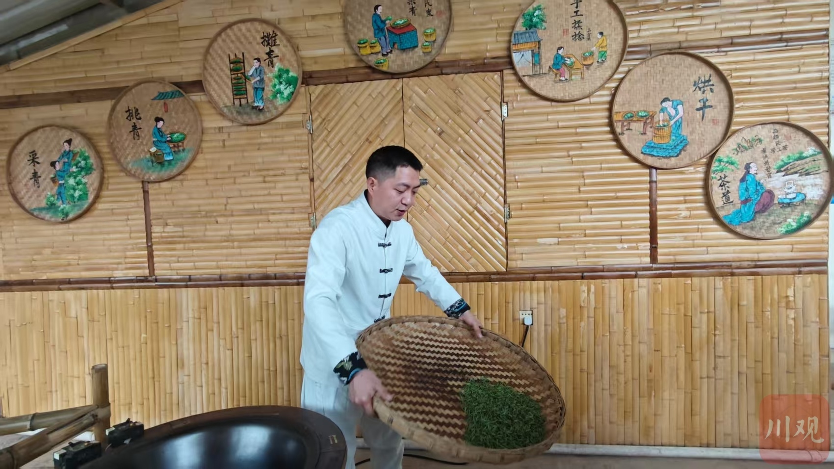 不远处的杨氏手工茶非遗工坊内,第六代传承人杨锌正忙着制茶。他先用簸箕筛去鲜叶杂质,再用300摄氏度高温铁锅徒手杀青,“杀青要快、透、匀,达到手捏成团、松手不散、对折不断即可。”翻炒、散热、揉捻,整套工序需反复3次,最后烘干成型。“每锅仅能炒6到8两鲜叶,成品只剩1到2两”,杨锌介绍,平日里,他和3、4名徒弟分工协作,一天能炒制20、30斤成品茶,供应春节市场。记者看到,他的手机里,预定春茶的订单已有十余单。