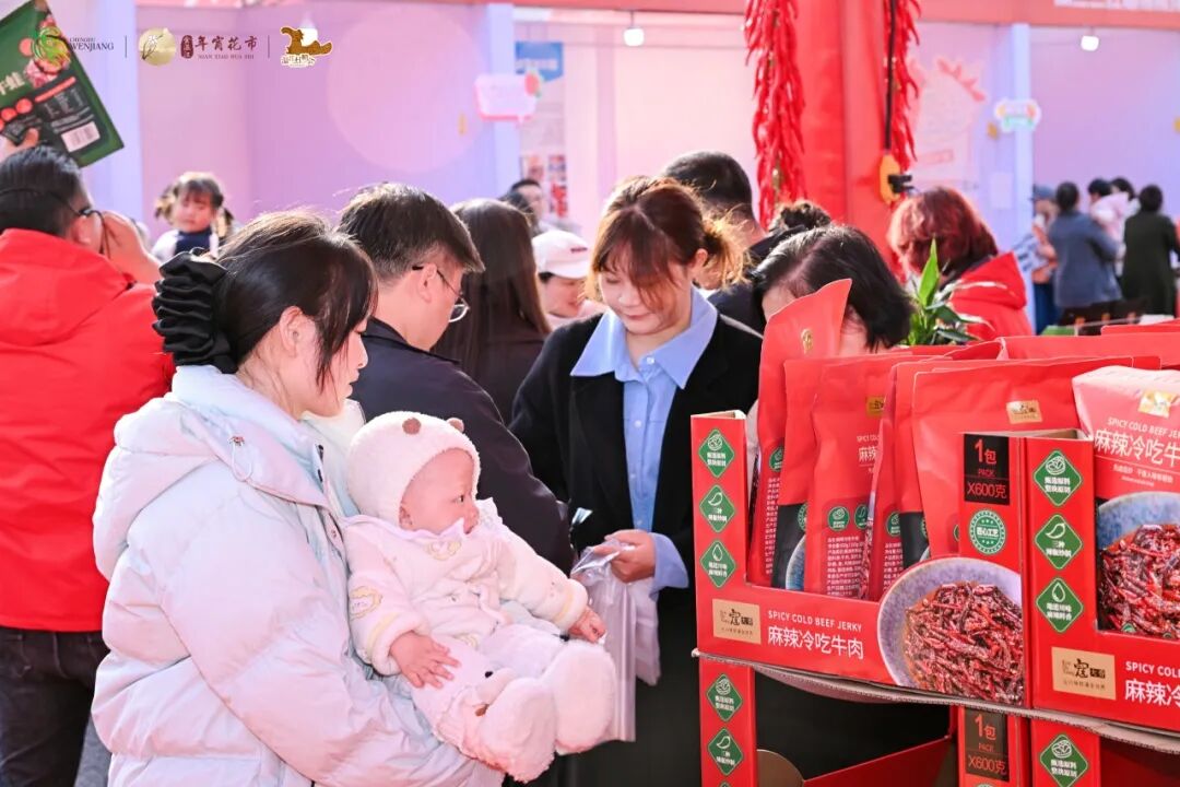 瑞阳食品手撕兔摊位前常常排起长队,企业生产负责人陈君平坦言,为保障市场供应,工厂全线满负荷生产,日产香辣兔超1000只,市集展位日均补货2—3次,成为年货爆款。