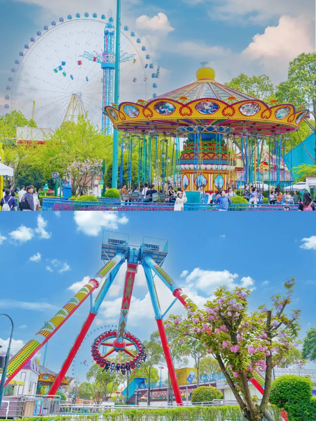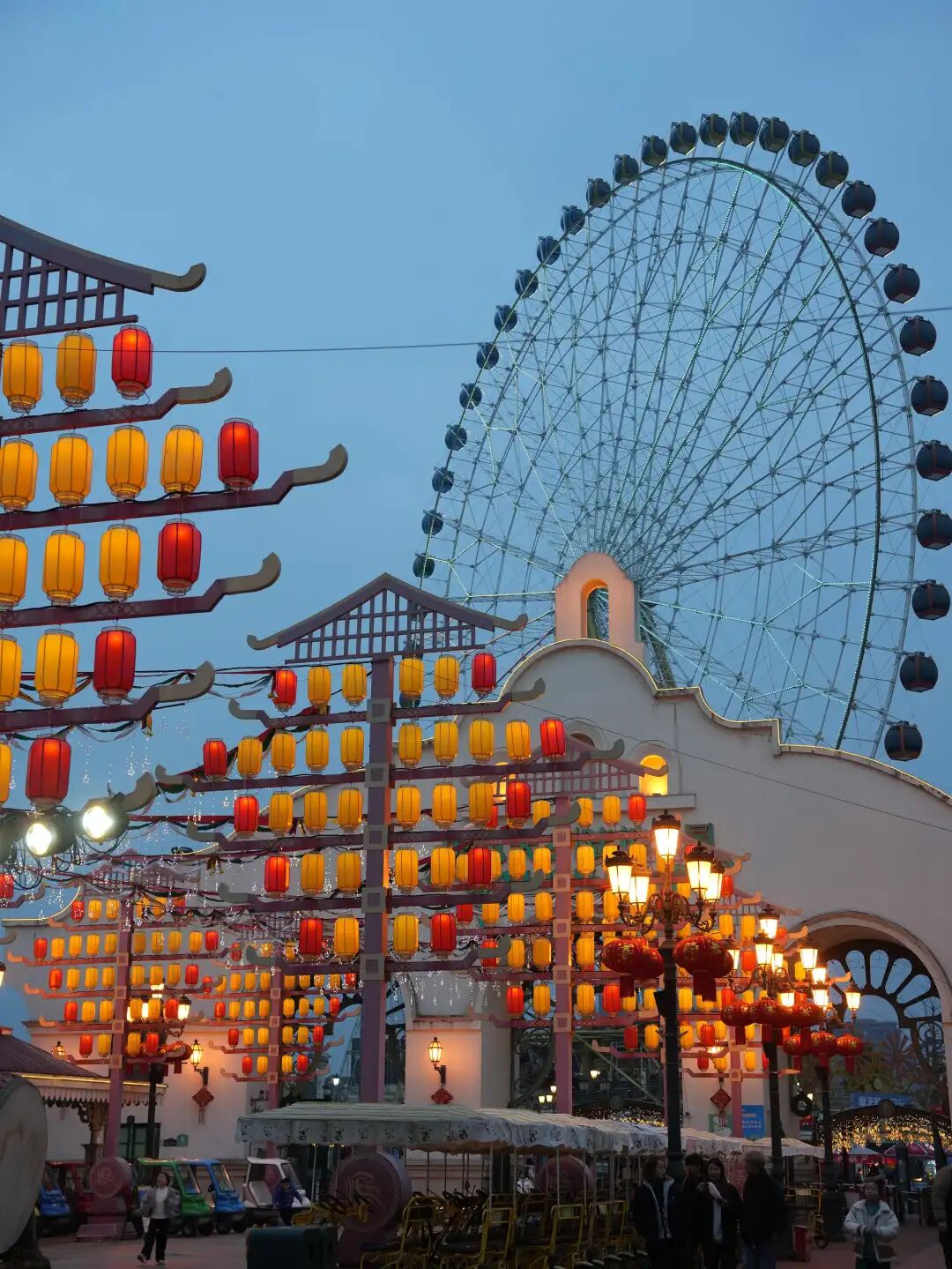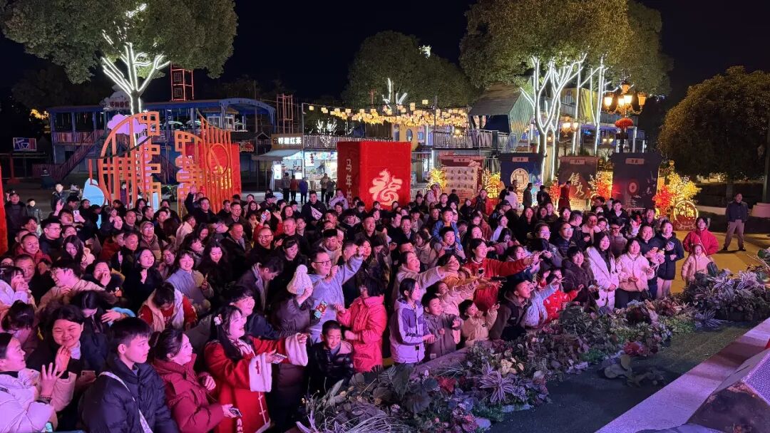大年初一晚上6时30分许,天色刚暗下来,国色天乡陆地乐园的幸福摩天轮下已被花灯点亮。还没走近,先听见热闹——欢快的锣鼓声、孩子的尖叫声、一家人的欢笑声汇聚在一起,把年味一路送到耳朵里。