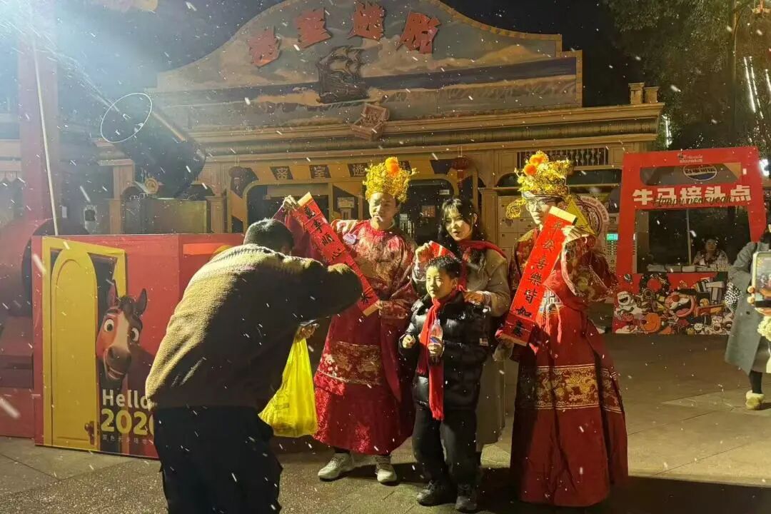 “财神来咯!”随着一声吆喝,身着红袍的财神被市民游客团团围住,大家争相和财神合影,以求好彩头。“财神看我!今年要发大财!”一个小伙子举起手机喊,财神爷扭头冲他比了个“耶”,逗得全场大笑。