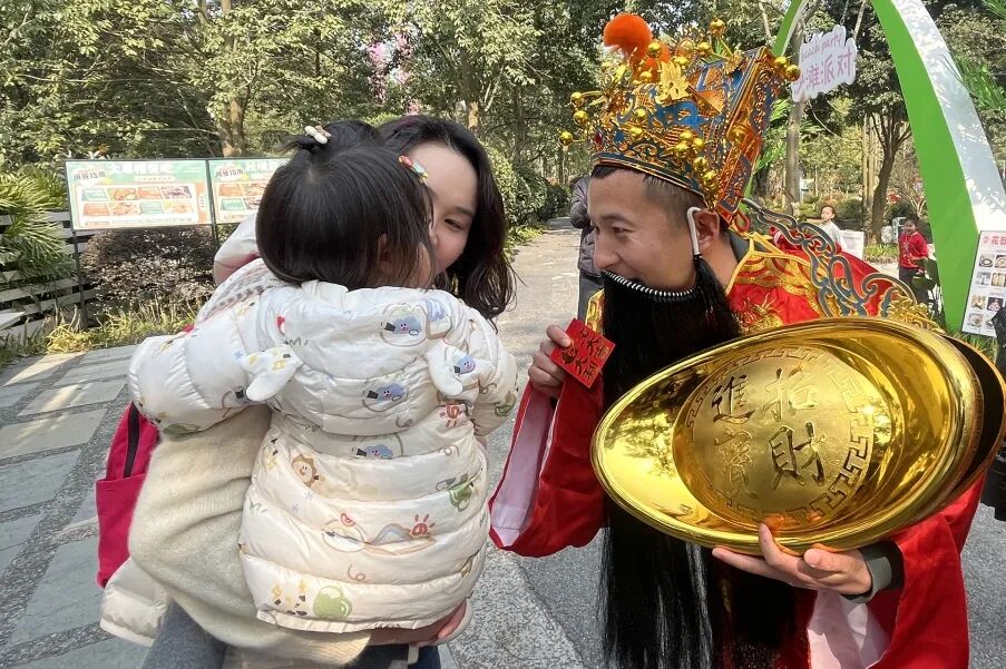 财神NPC刚一现身,便被热情的市民游客层层围住。拜年、发红包——每一次互动都引来阵阵欢呼,福气从财神手中递出,笑意在人群里荡漾开来。“刚才财神爷爷给我红包啦!祝大家马年大吉,恭喜发财!”小朋友王宇彤高举着红包,脸上写满兴奋。