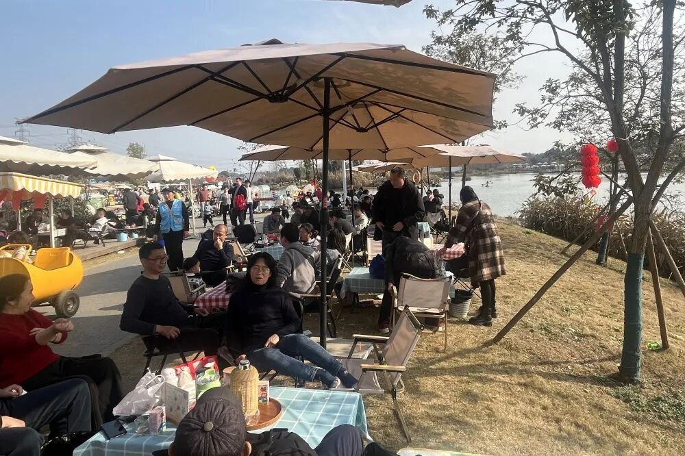 大年初三的午后两点,阳光正好,鲁家滩湿地公园蜿蜒的绿道上游人如织,推着婴儿车的亲子家庭、牵手漫步的情侣,成群结队地走进这里,与春天亲密相拥。目光转向凫岛,欢笑声便盈满了耳朵。孩子们把活力留给了宽阔的草坪,家长们则把惬意留给了暖阳下的茶席。袅袅茶香中,流淌着新年最舒缓的节拍。