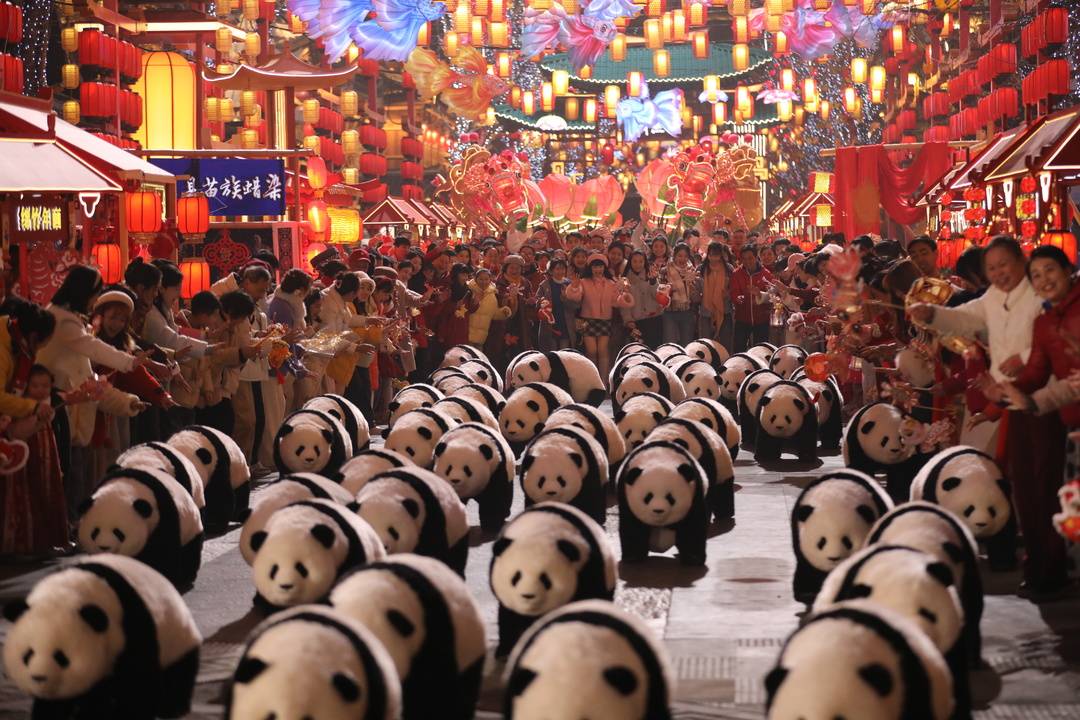 春酒一台,春和景明,五谷丰登。宜宾分会场除了谭松韵、罗云熙、张含韵、魏翔、张歆艺等川籍演员倾情加盟表演外,合江街的新春市集上,遂宁的桃子龙、乐山的沐川草龙、兴文的大坝高装、江安的竹簧等数十项来自四川的非物质文化遗产琳琅满目、鲜活亮相;机器“大熊猫”穿梭街巷,书法家挥毫落笔,写下杜甫歌咏宜宾风物的名句“重碧拈春酒、轻红擘荔枝”。501白酒文化圣地的长桌宴中,五粮液、燃面、土火锅、椒麻鸡、筠连水粉,摆席上桌,色香诱人。万象宜宾天地里,魔法原子生产的机器狗、机器人在小朋友的带领下,萌动起舞,既强化四川标识,更让天府烟火气扑面而来。