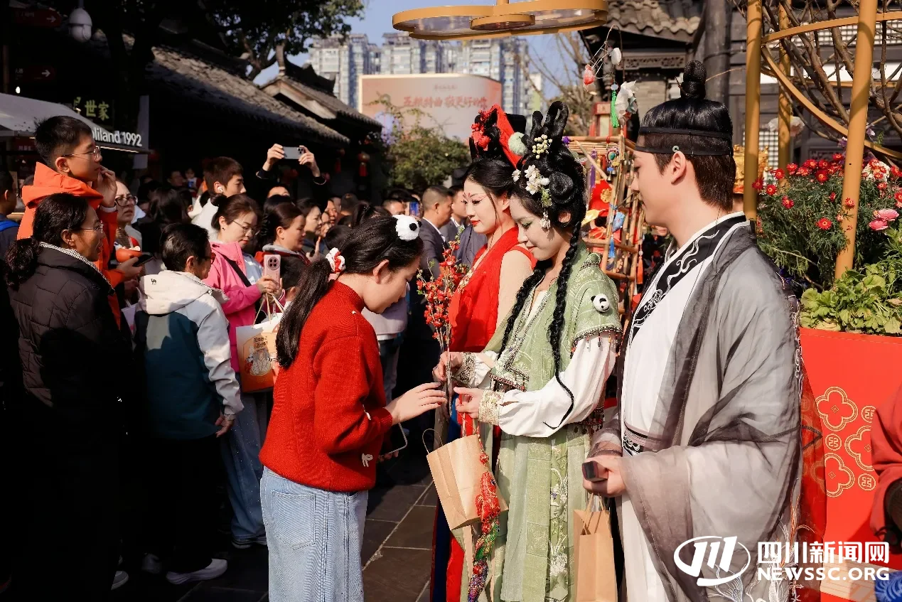 “财神到,福气来!”“祝大家马年大吉、财源广进!”财神NPC一路拱手送福,与游客热情互动,还穿插新春知识问答,答对即可获得新春小礼。来自贵州的游客李先生抢答成功,拿到礼品后兴奋地说:“在成都过初五太有仪式感了,不仅能接财神,还能学到民俗文化,年味特别足。”