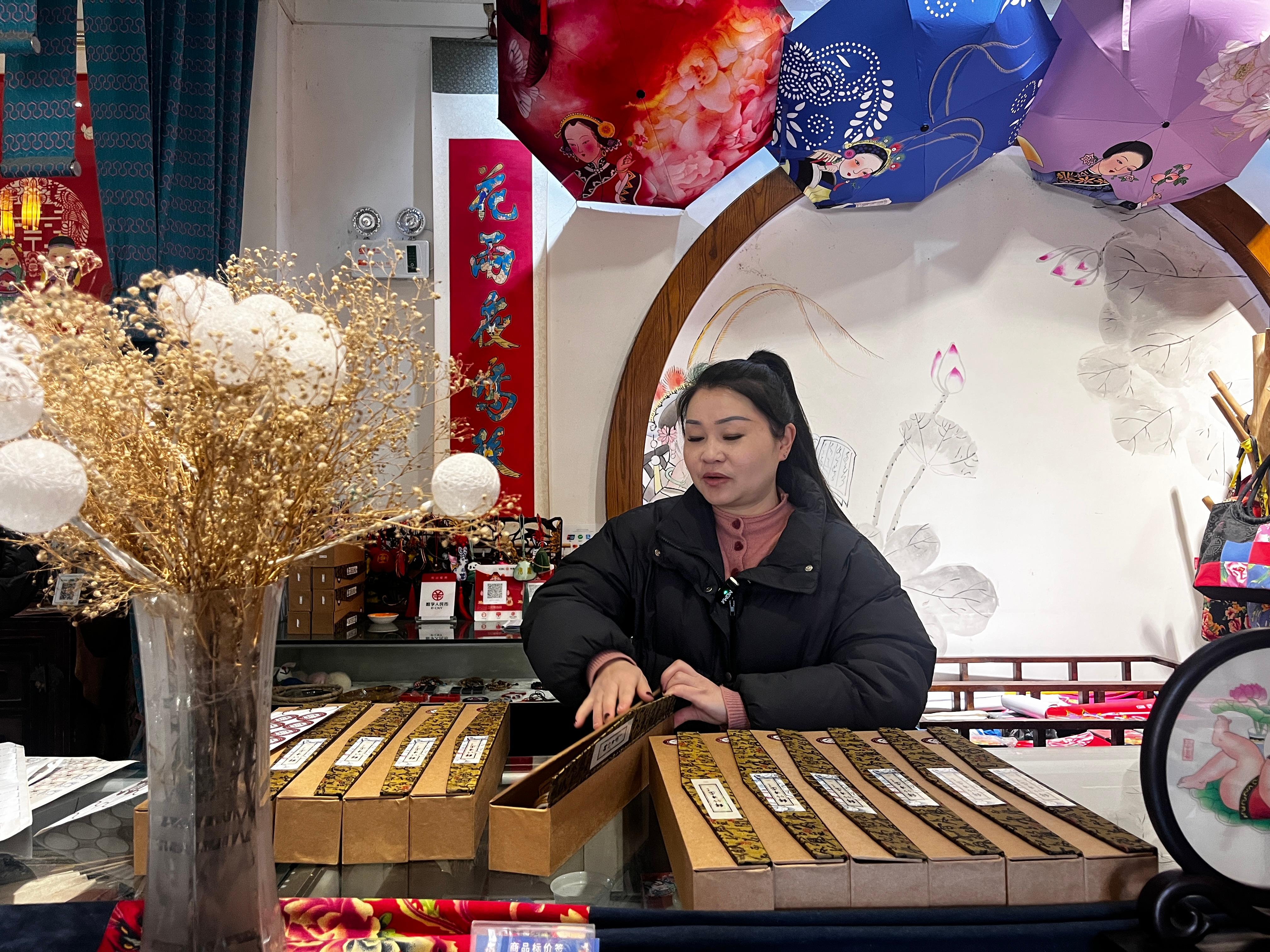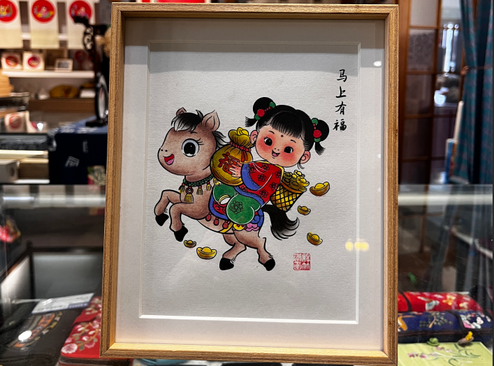 在三彩画坊,融入马年元素的创新年画《马上成功》《马上有福》等备受市民、游客喜爱。当天上午,店员曹华芬正在打包客人预订的十多份年画产品《马上有福》,“很多人买来作为年礼送给外地的亲朋好友,既有年味儿又与马年应景。”曹华芬介绍,作品中年画娃娃骑的竹马和身旁飞的蝴蝶,分别指“马”和“福”,寓意“马上有福”。