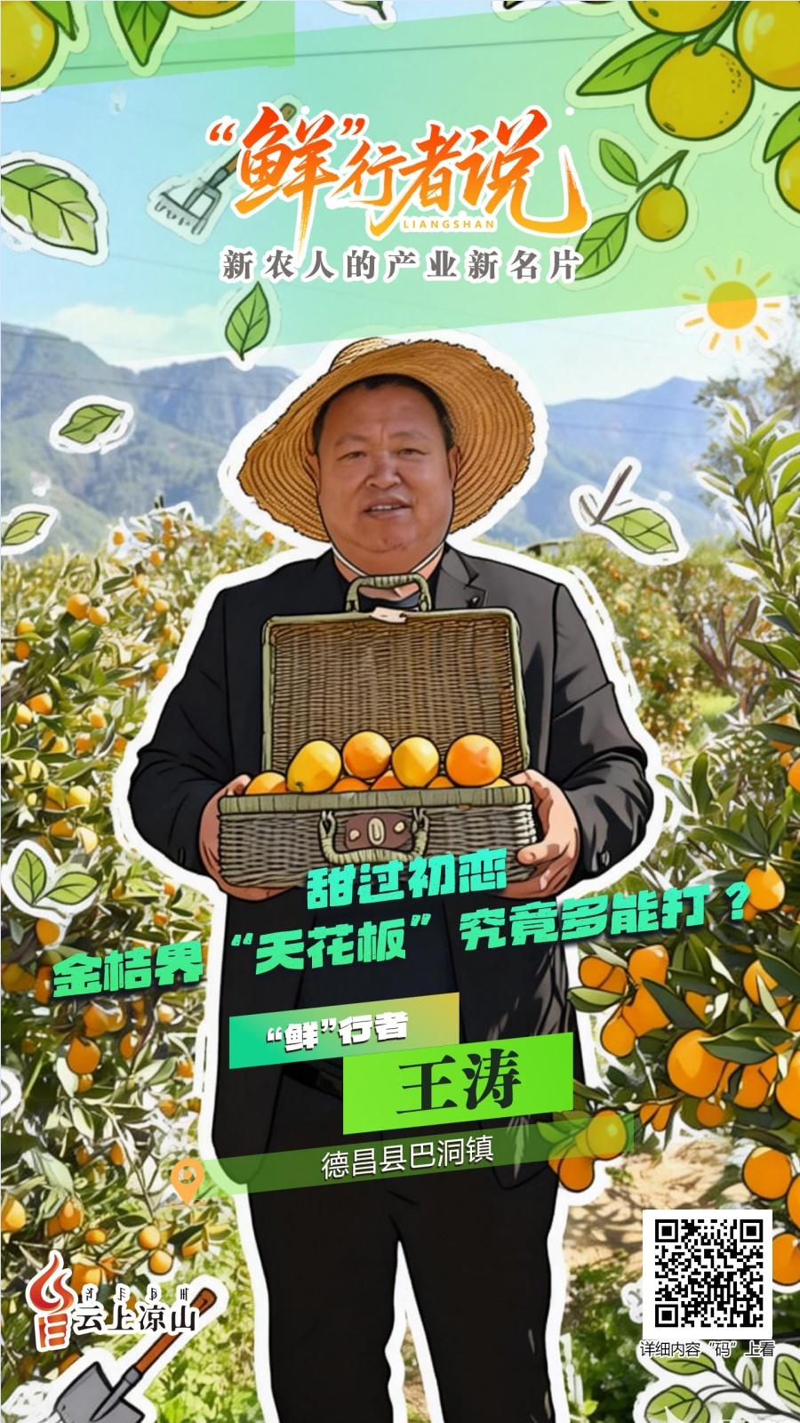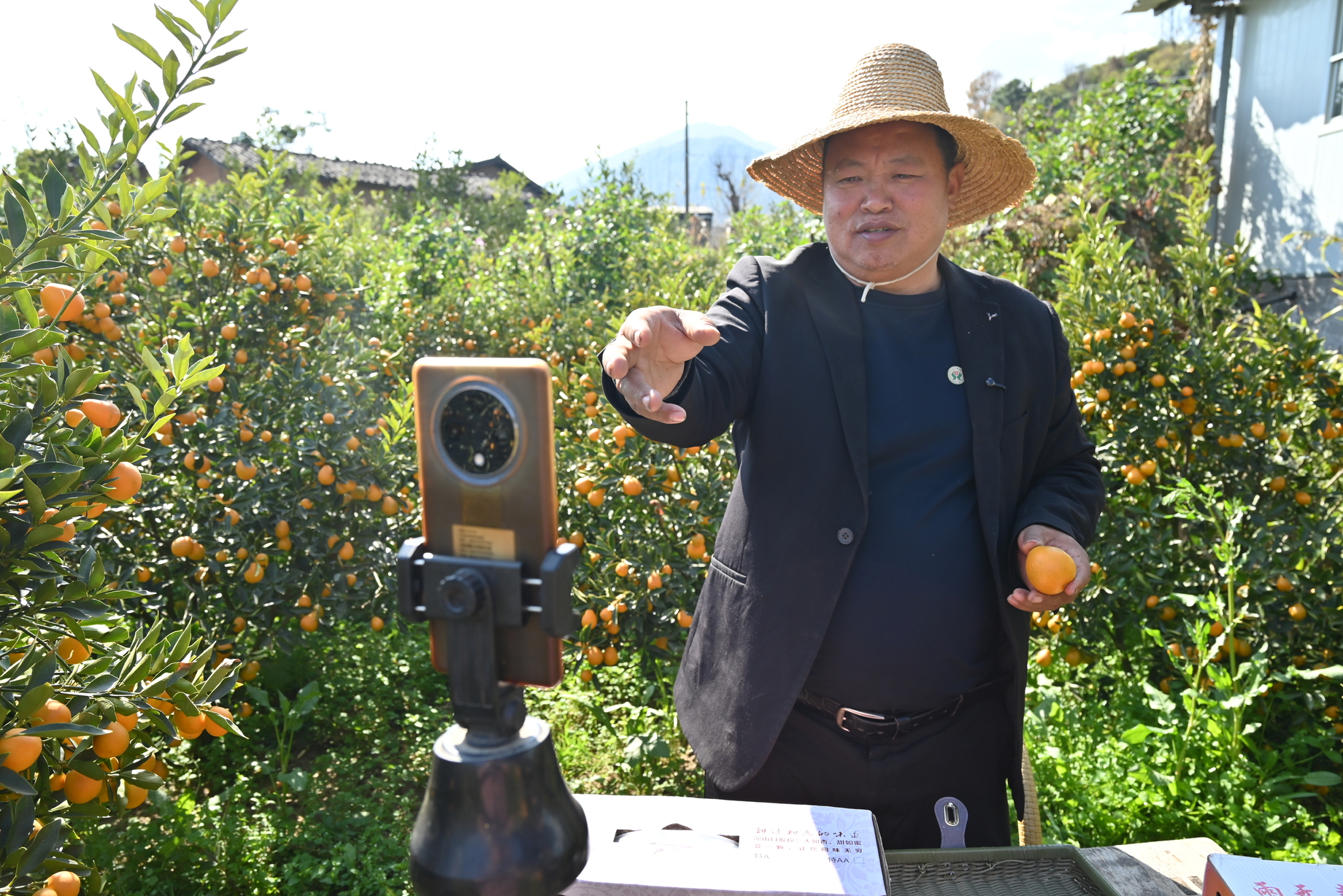 镜头前,凉山德昌雨无声金桔种植专业合作社理事长王涛手里拿着圆鼓鼓、金灿灿的金桔,正在手机直播带货。他身后,是绵延起伏、翠绿缀金的万亩桔园。
