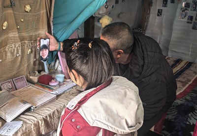 摩托车停在16岁的彝族女孩土比木此作家门口。女孩赶快拿出寒假作业,请杨皓帮忙检查一下。