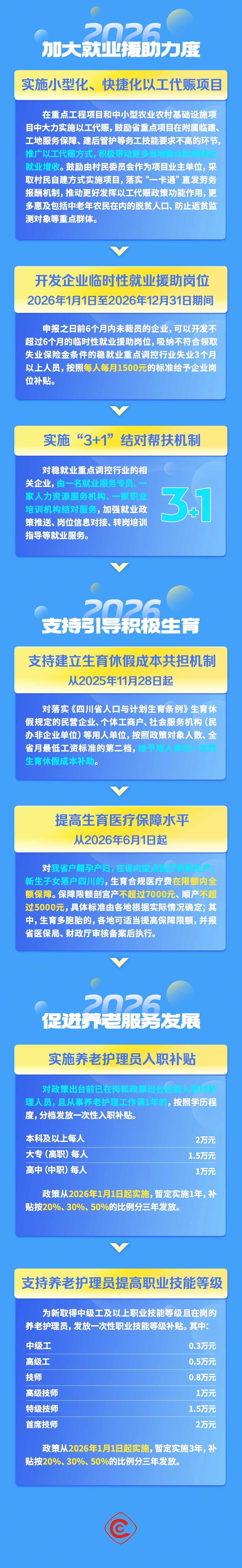 在促进养老服务发展方面,《政策措施》提出,实施养老护理员入职补贴、支持养老护理员提高职业技能等级。2026年起,对已在岗和新入职的,且从事养老护理工作满1年的,按学历程度分档发放一次性入职补贴,补贴资金分3年发放,最高补贴2万元;2026年起,对新取得中级工及以上职业技能等级且在岗的养老护理员,按取得的职业技能等级分档发放一次性职业技能等级补贴,补贴资金分3年发放,最高补贴2万元。