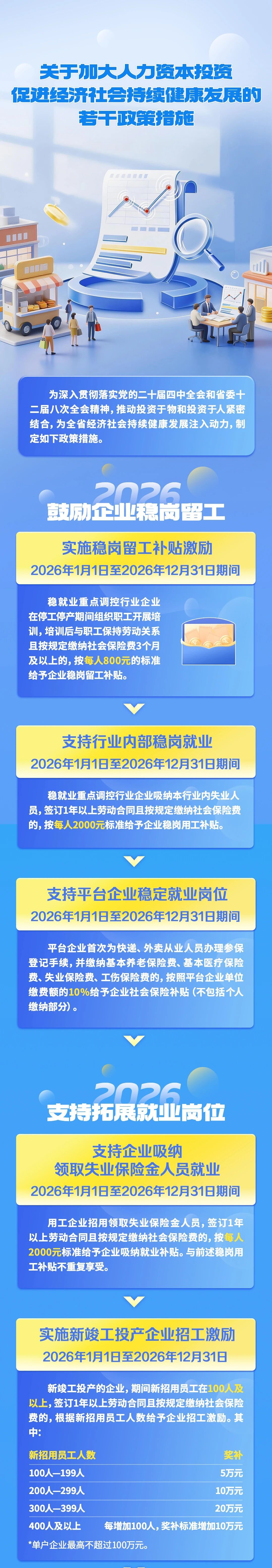 注重挖潜拓新。在拓展就业岗位方面,《政策措施》特别注重在新竣工投产企业和新兴领域企业拓展就业增量。比如,对2026年期间新竣工投产企业,按招用人数分档给予企业招工激励,单户企业最高不超过100万元;对文化、体育、旅游、养老、托育和数字经济等领域的企业,2026年裁员率低、2027年用工人数增加,且稳定就业6个月以上的,根据用工人数分档给予企业扩岗奖补,最高奖补60万元。