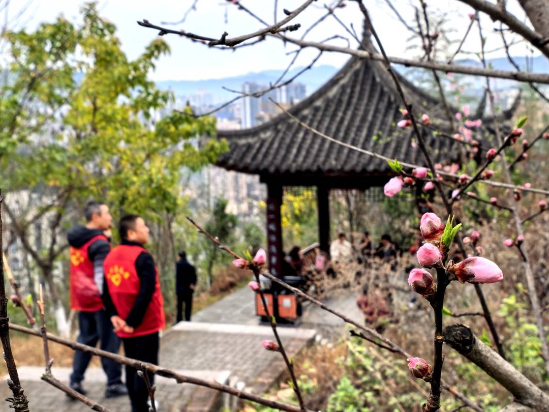 清晨时分,登山步道早已人流如织,鲜艳的红围巾、喜庆的福字贴与青山绿树相映成趣。通天梯、青云步道等多条线路有序分流游客,市民沿途打卡红军亭、元稹纪念馆,在移步换景的人文景致中,读懂元九登高纪念先贤、祈福安康的文化内涵。
