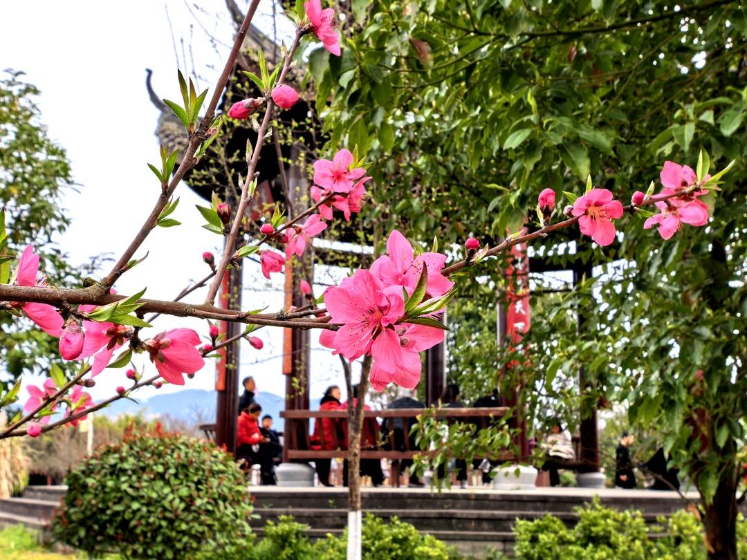 小憩的市民和盛开的桃花相映成趣。曾业 摄