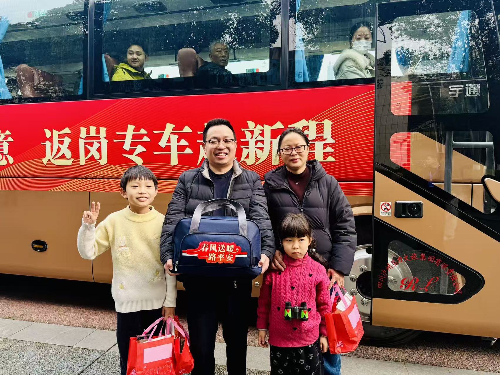 25日早上8点过,朋友把我送到泸州市奥林匹克体育公园中心广场,参加务工人员送别活动,等一会儿由专车把我们送到机场,再坐飞机到南京,全程都是免费。说实话,我非常高兴,因为不用为了返程票不好买去折腾。我每年过年都要回泸州老家,记得前几年有一回买不到火车票,我们一家转道成都,才搭上了飞机。