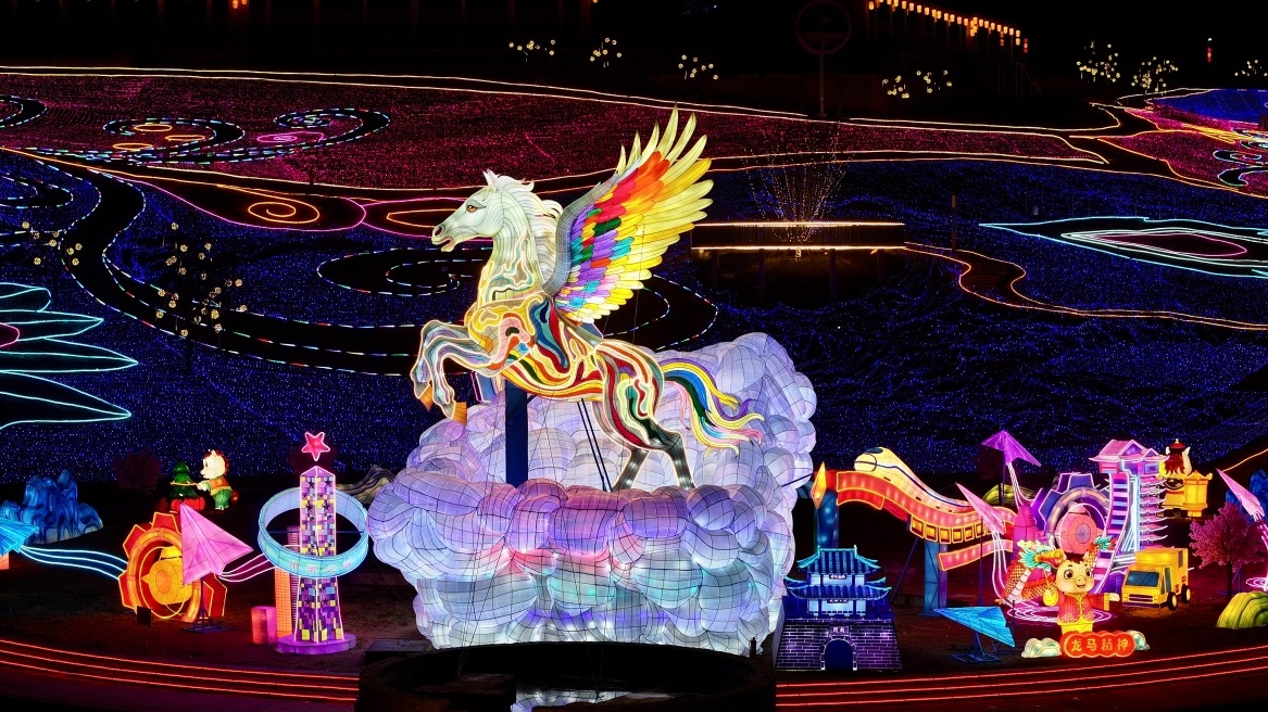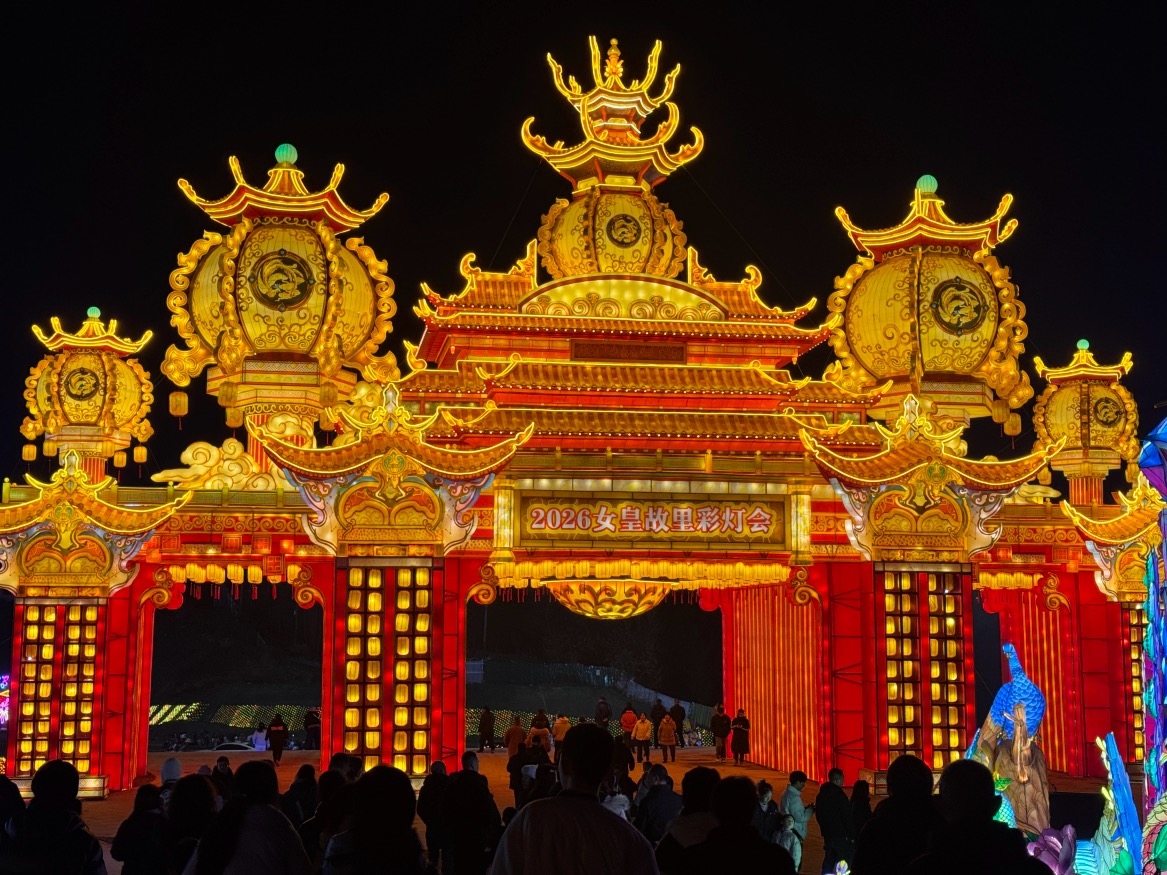 2月17日,正月初一,2026女皇故里彩灯会如期点亮夜空,10米高的核心灯组“万象腾飞”昂首跃起,五彩飞马踏光而行,恰合丙午马年“骐骥奔腾”的吉祥寓意;“女皇贺春”灯组中,Q版媚娘笑意盈盈,与游客挥手互动,让厚重的历史文化变得可亲可感。