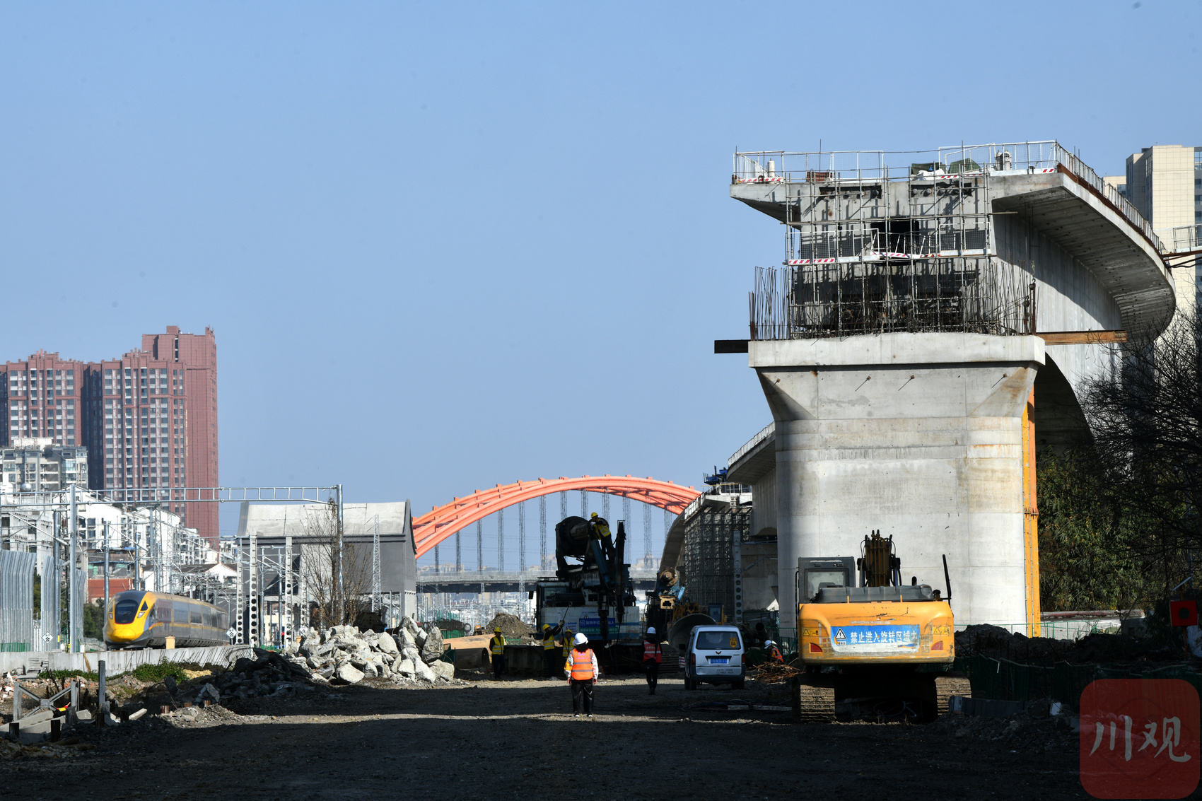 此次记者来到的建设现场,就是成渝中线进出站的最后一段路。这段路中不止成渝中线高铁一条路,在宽约50米的范围内,包括成渝中线两条铁轨在内,共有9条铁路线一字排开;在长约1.2公里的区间里,铁路线需要跨越沙河、繁忙的市政道路。铁路线两侧还有不少居民区。