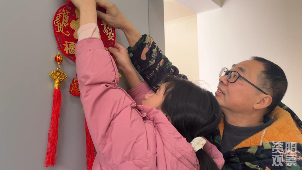 王廷学和大女儿一起挂“福”字。