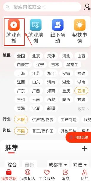 方式一:进入APP首页→点击“就业服务”→点击“就业直播”进入直播间。