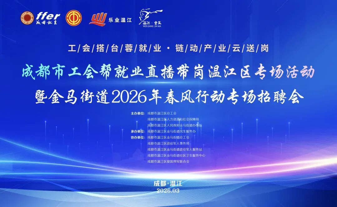 由区总工会、区人社局、金马街道主办的成都市工会帮就业直播带岗温江区专场活动暨金马街道2026年春风行动专场招聘会,将于今日下午在金马街道举行。此次专场活动,旨在为有求职需求的高校毕业生、转岗待岗职工、困难职工家庭成员、残疾职工、农民工、新就业形态劳动者等重点就业群体,搭建“线上+线下”的精准对接平台,真正实现“春风送岗促就业,精准服务助发展”。