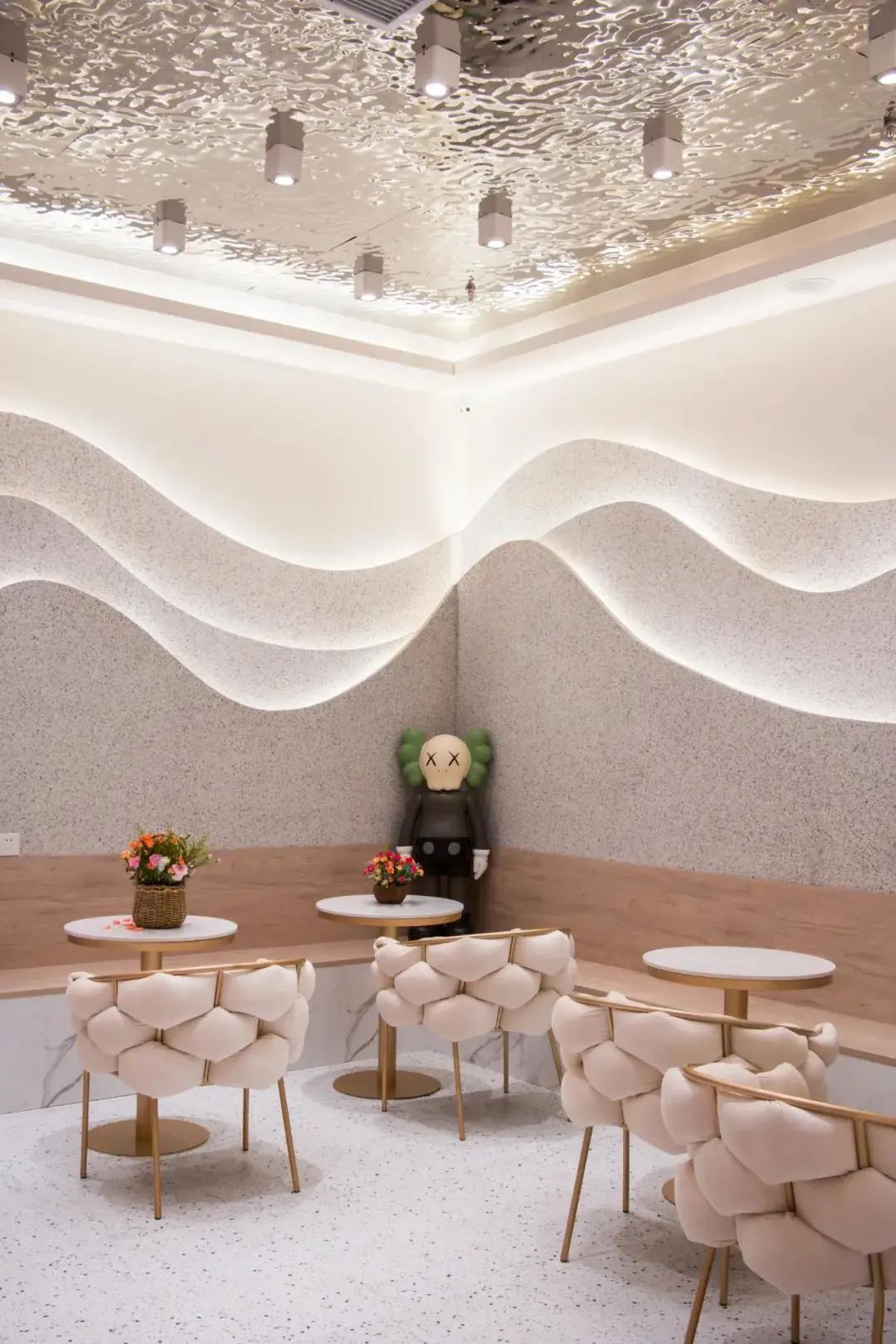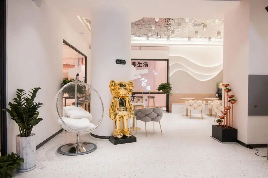 新光天地店装修和宫野奶茶一样,让人眼前一亮,灯具与鲜花绿植的搭配颇有质感,带有金属的白色桌子和墙面相得益彰,随处可见国潮元素,与手中的那一杯奶茶,甚配。
