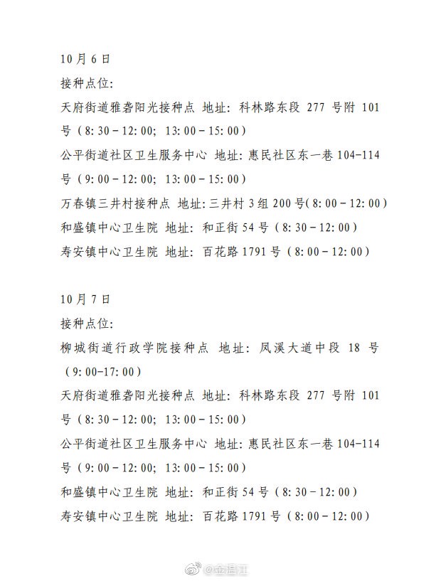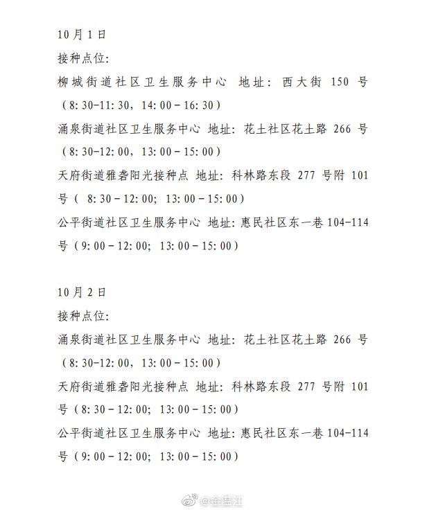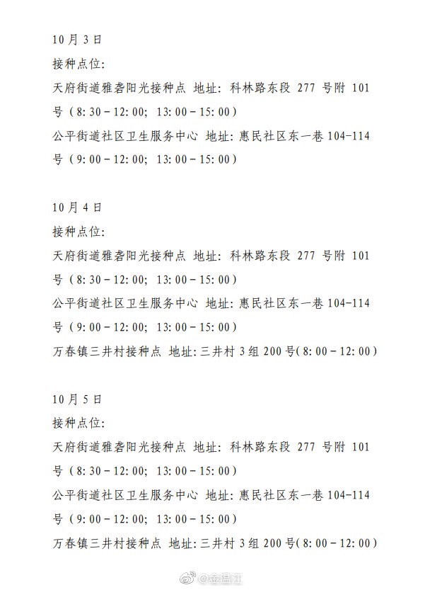 10月1日早上9点,在成都温江公平街道新冠疫苗临时接种点(惠民点),有市民趁着假期来接种新冠疫苗。现场负责人介绍说:"今天接种疫苗的以学生和中青年人居多,大家利用休假时间来接种。"据了解,国庆期间温江区部分疫苗接种点将持续提供疫苗接种服务,具体点位和服务时间见下图