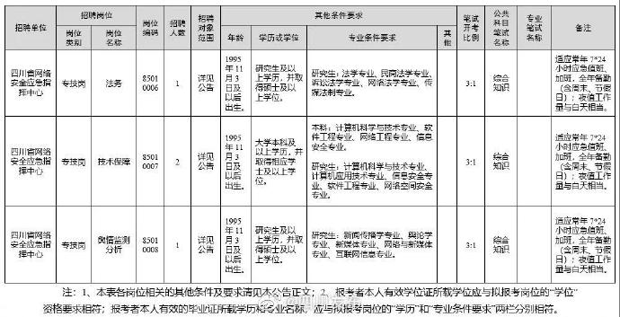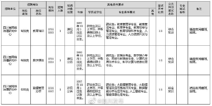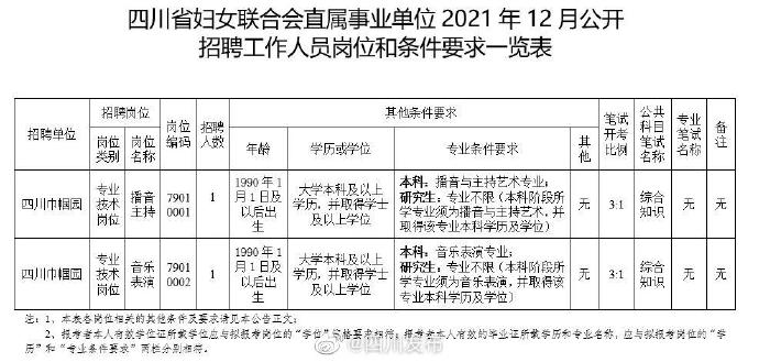 10月25日,四川省人力资源社会保障厅网站发布2021四川省属事业单位公开招聘公告。报名时间为2021年11月3日10∶00至11月7日18∶00,笔试时间定于2021年12月4日举行。本次招聘包含有四川省妇女联合会、四川省人民防空办公室、中共四川省委网络安全和信息化委员会办公室、四川省信访局、四川广播电视台等所属事业单位。部分招聘如下↓↓
