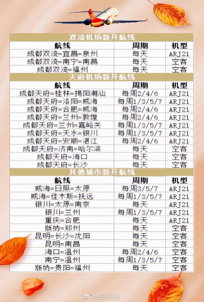 10月27日,成都航空发布了冬春航季航班计划,新航季成都航空在成都双流国际机场新开3条航线,同时将目前成都双流机场运营的17条航线转场至成都天府国际机场运营。本月31日起,我国民航正式执行冬春航季航班计划。(成都日报锦观)