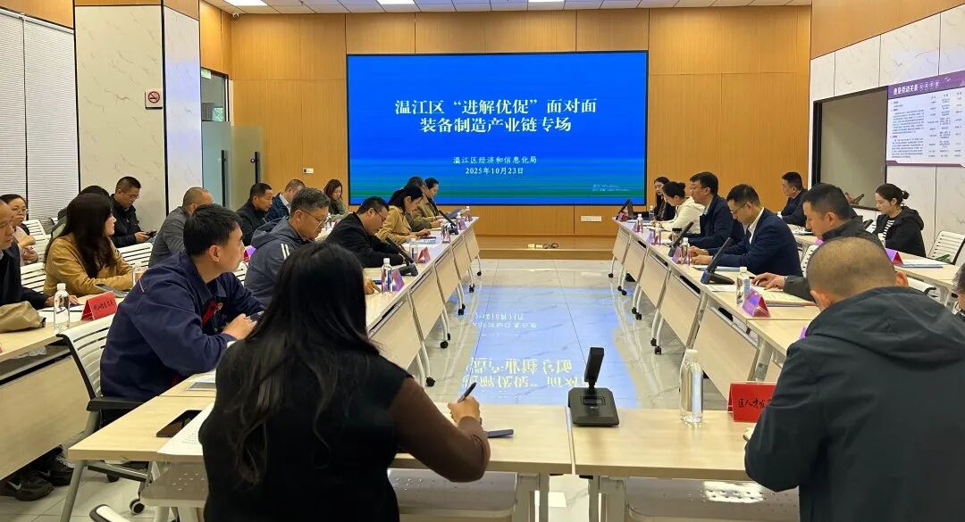 10月23日,温江区“进解优促”面对面装备制造产业链专场座谈会在温江高新区举行,区经信局、区发改局(区企业发展促进中心)、温江高新区等10余个部门、园区和镇街及10余家装备制造产业领域企业代表齐聚一堂,通过“面对面”沟通、高效回应企业诉求,进一步做实“进解优促”,坚定企业深耕温江发展信心,助力装备制造产业跑出发展“加速度”。