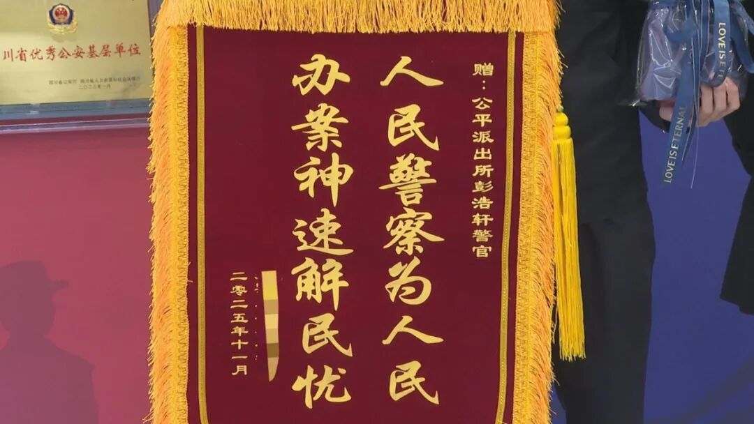 “你们一心为民,我们必须要来当面感谢!”11月22日上午,陈女士来到公平派出所,将一束鲜花和写有“人民卫士,办案神速”的卡片、“人民警察为人民,办案神速解民忧”的锦旗送到了彭浩轩手中。