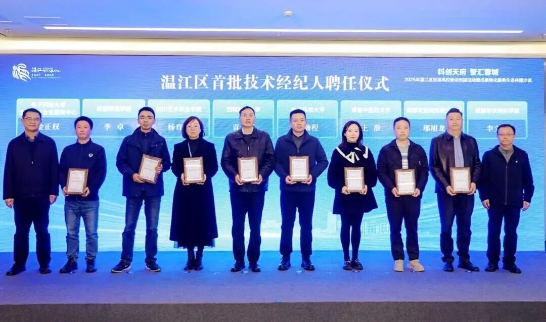 活动举行了温江区首批技术经纪人聘任仪式,为8名技术经纪人代表颁发聘任证书。首批技术经纪人来自电子科技大学、成都中医药大学等驻温高校院所,他们将成为链接高校院所前沿科研成果与区内企业技术需求的核心纽带,为科技成果就地转化提供专业服务与精准支撑,加速完善温江技术转移服务生态体系。