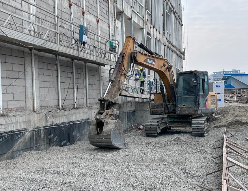 打围施工区域内,挖掘机正在平整道路