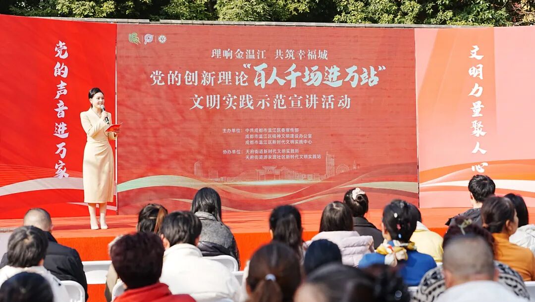 从新时代文明实践站到居民院落,温江区将依托各级新时代文明实践阵地,持续推动党的创新理论“百人千场进万站”文明实践宣讲活动向院落楼栋深度延伸,通过更多“理论+文艺”“服务+体验”的场景化宣讲,让理论宣讲有高度有温度,接地气冒热气,把新思想的种子播撒到群众心坎里,让党的创新理论在温江落地生根、开花结果。