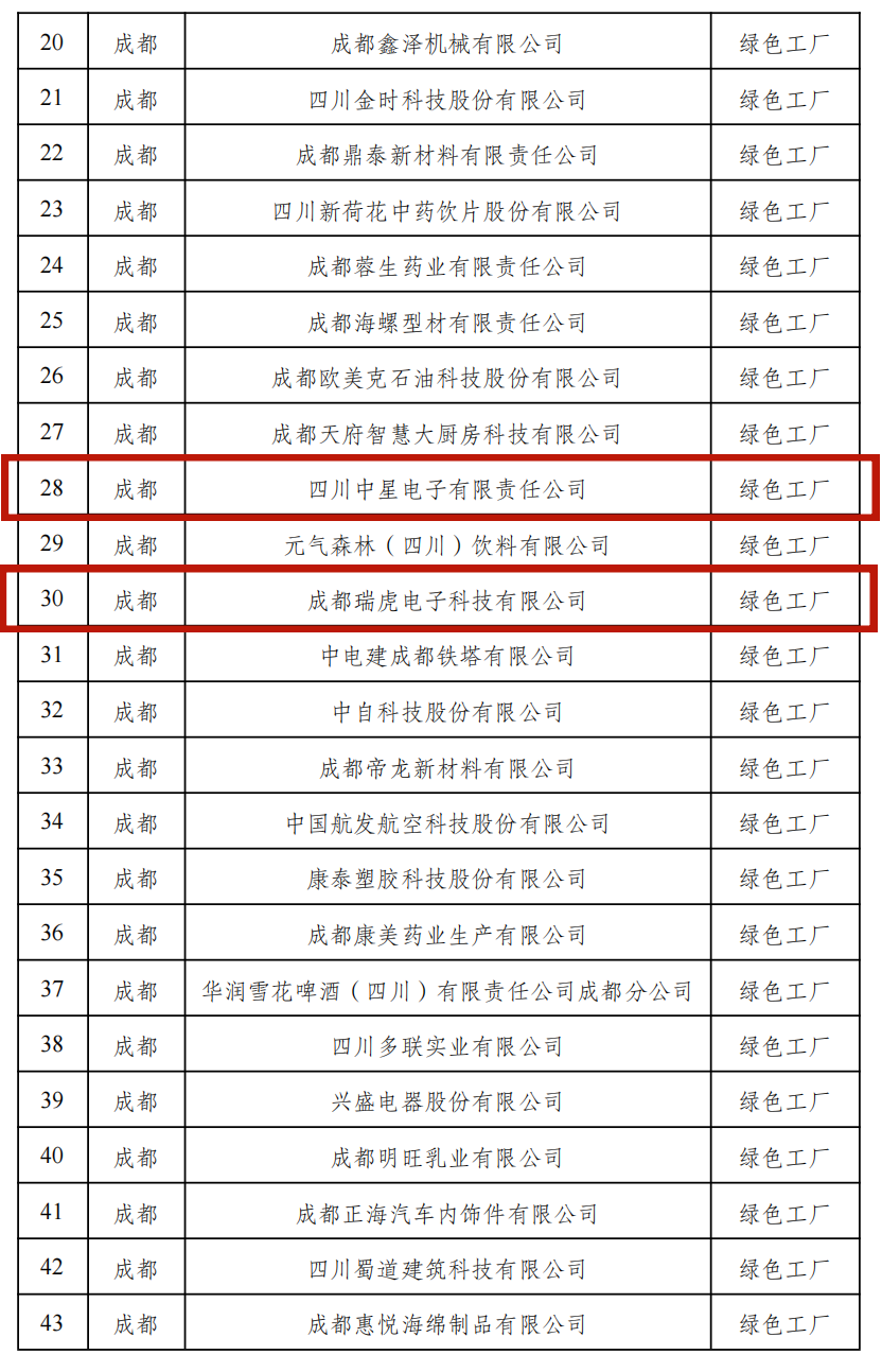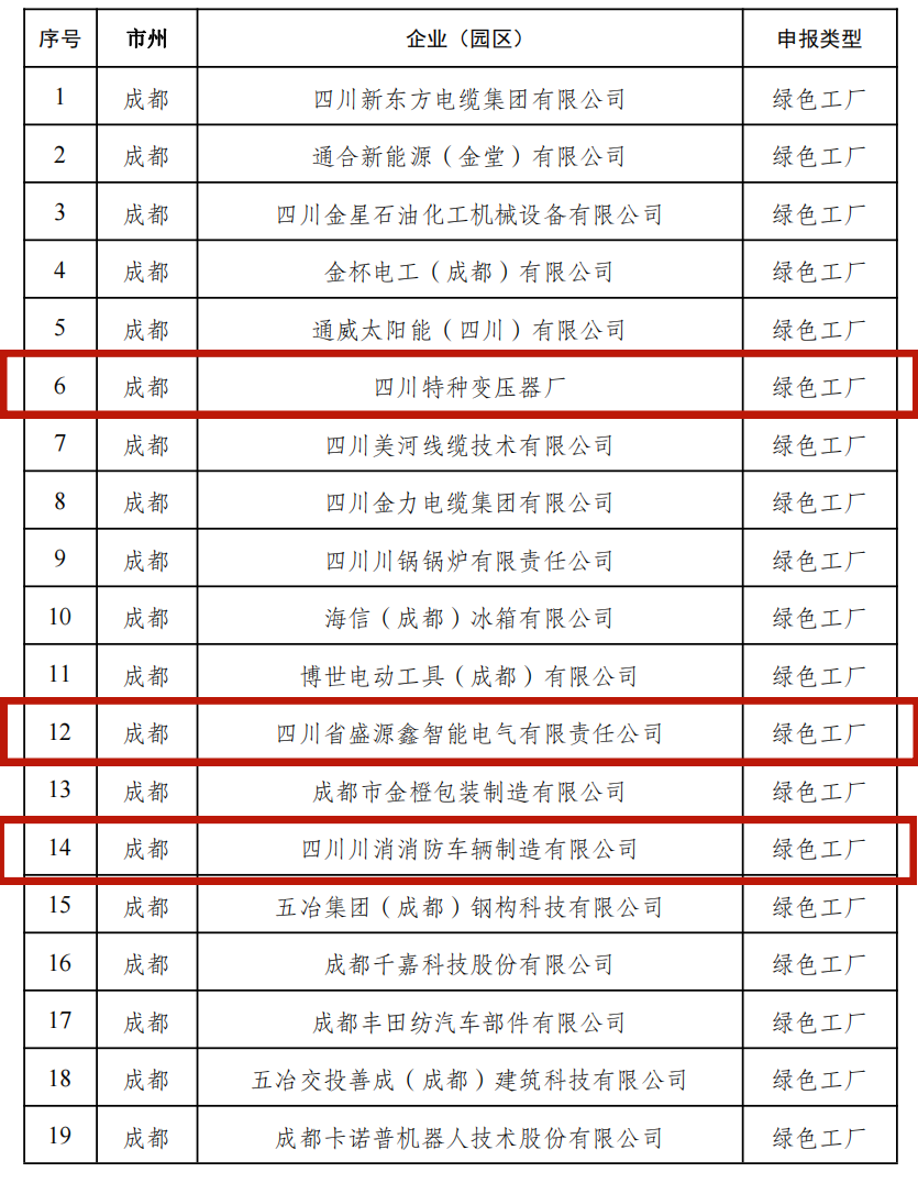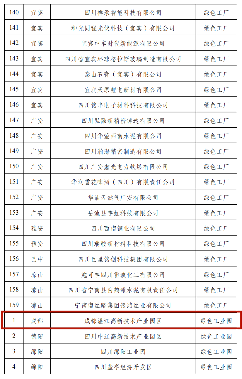 成都温江高新技术产业园区拟确定为省级绿色工业园;四川特种变压器厂、四川省盛源鑫智能电气有限责任公司、四川川消消防车辆制造有限公司、四川中星电子有限责任公司、成都瑞虎电子科技有限公司、四川中农润泽生物科技有限公司、成都鸿洋包装有限公司、四川祥和鸟服饰有限公司、正升环境科技股份有限公司、四川水思源环境科技有限公司、成都顶益食品有限公司11家温江企业拟认定为省级绿色工厂。