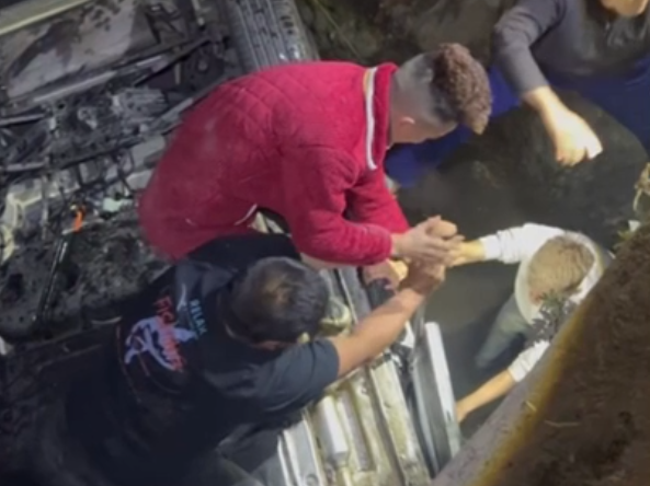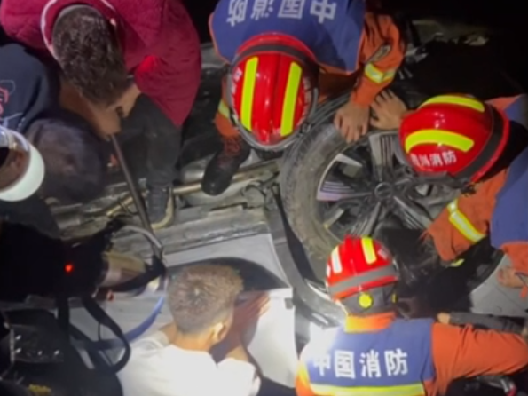 李杰与亲友们一边安抚被困者的情绪,一边迅速分工展开救援。他们拦下一辆过路车辆,借来照明工具和撬棍,试图撬开严重变形的车门。然而因车身结构变形,车门紧紧卡死,即便众人合力,也只能撬开一道狭窄的缝隙,远远不足以让被困人员脱身。