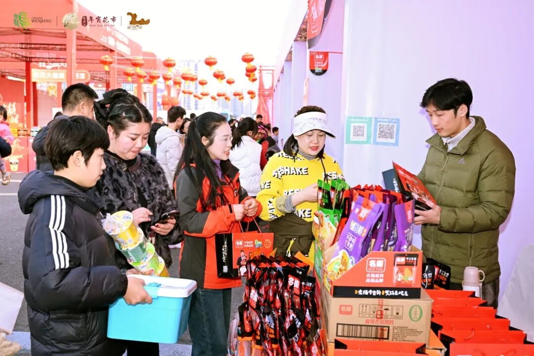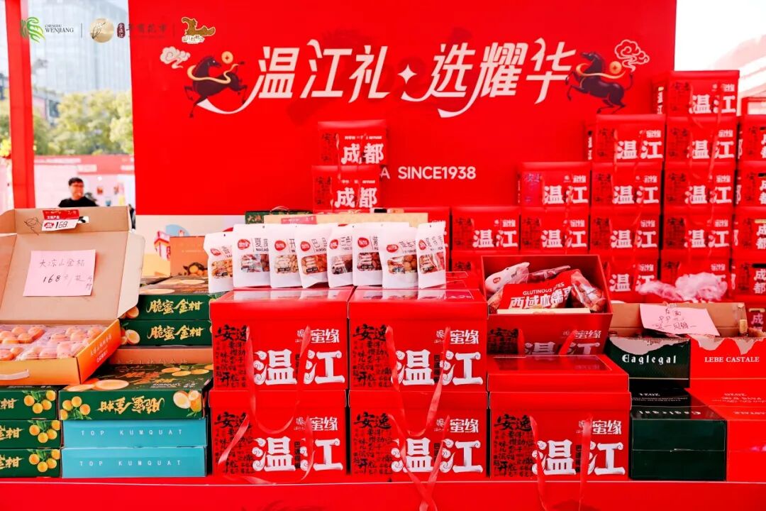 除了新春花礼,金温江年宵花市更将年味与烟火气拉满。年货集市和村糖酒肆集结90余家优质企业,各类“温江造”年货好物集中亮相,吃的、喝的、用的应有尽有。