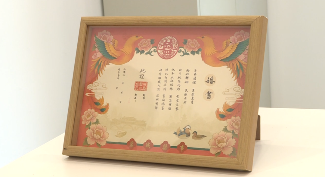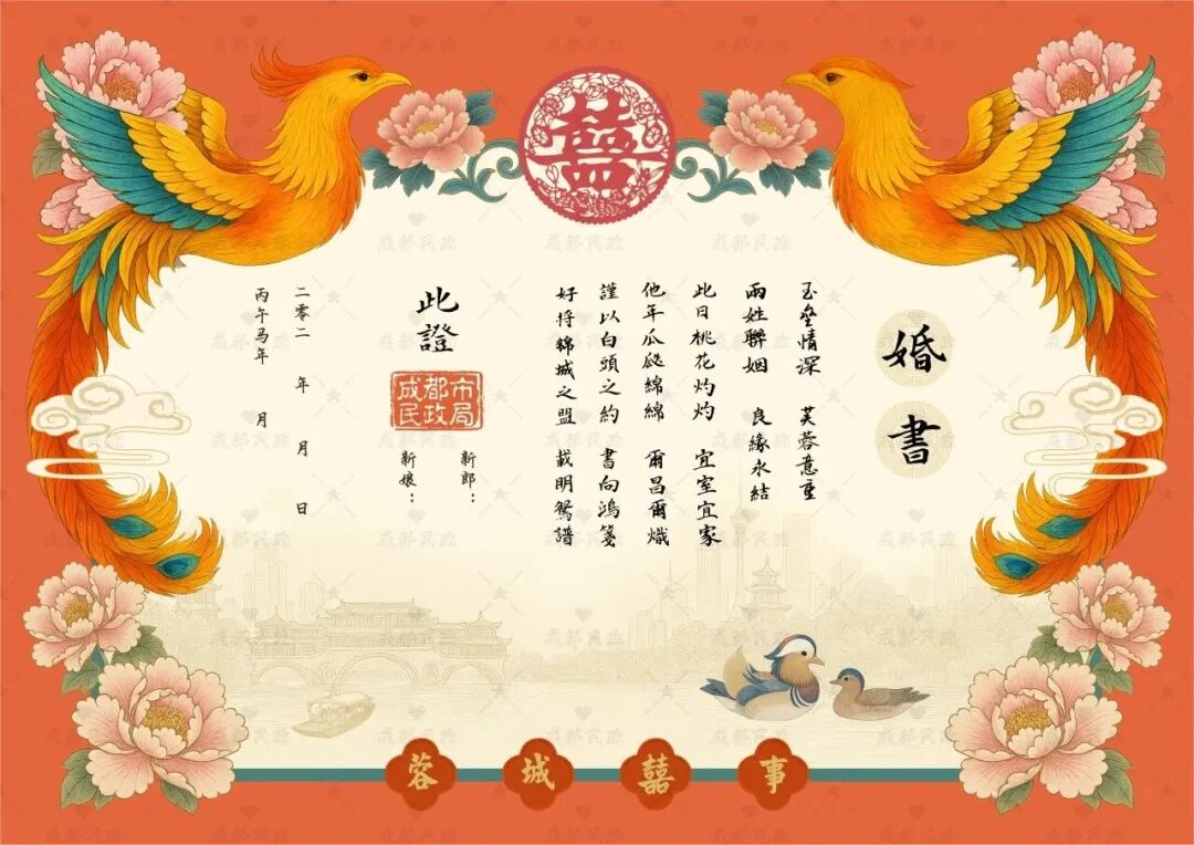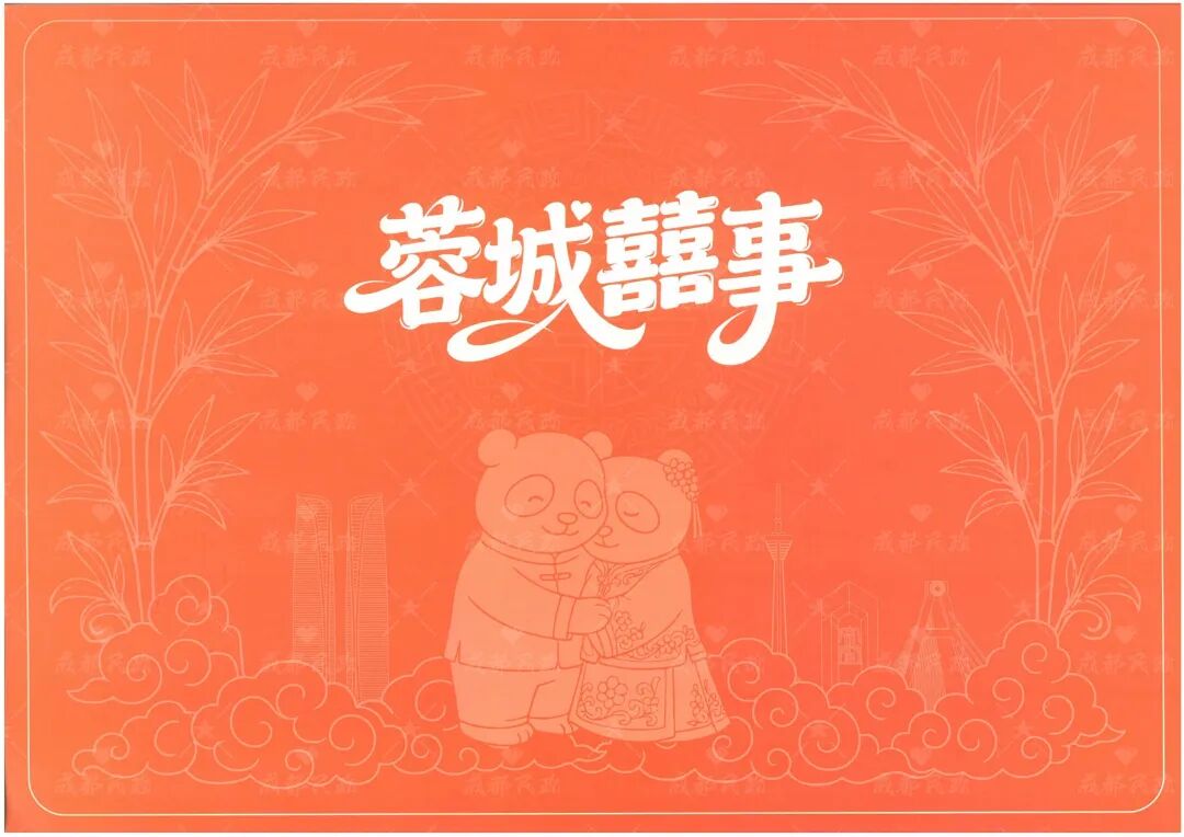 随着结婚证一起送到小两口手上的,还有成都新版“蓉城囍事”主题婚书。这也是在温江发出的首份成都新版“蓉城囍事”主题婚书。这份新版“蓉城囍事”主题婚书以大红为主色调,融合凤凰、熊猫、蜀绣、芙蓉等元素,还融入望江楼、安顺廊桥等成都地标,兼具传统韵味与城市特色,既是祝福见证,也是一份专属成都的浪漫纪念。