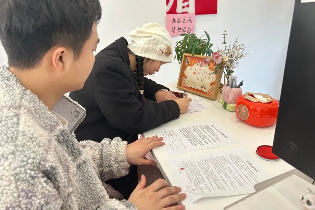 2月24日上午9时30分,暖阳洒在温江区民政局鲁家滩婚姻登记处的窗前,映照出一张张幸福的脸庞。作为马年首个工作日前来办理婚姻登记的第一对新人,市民舒陈东与王苑露满怀期待地走进登记大厅。