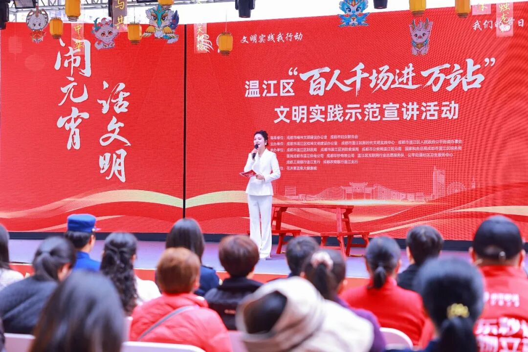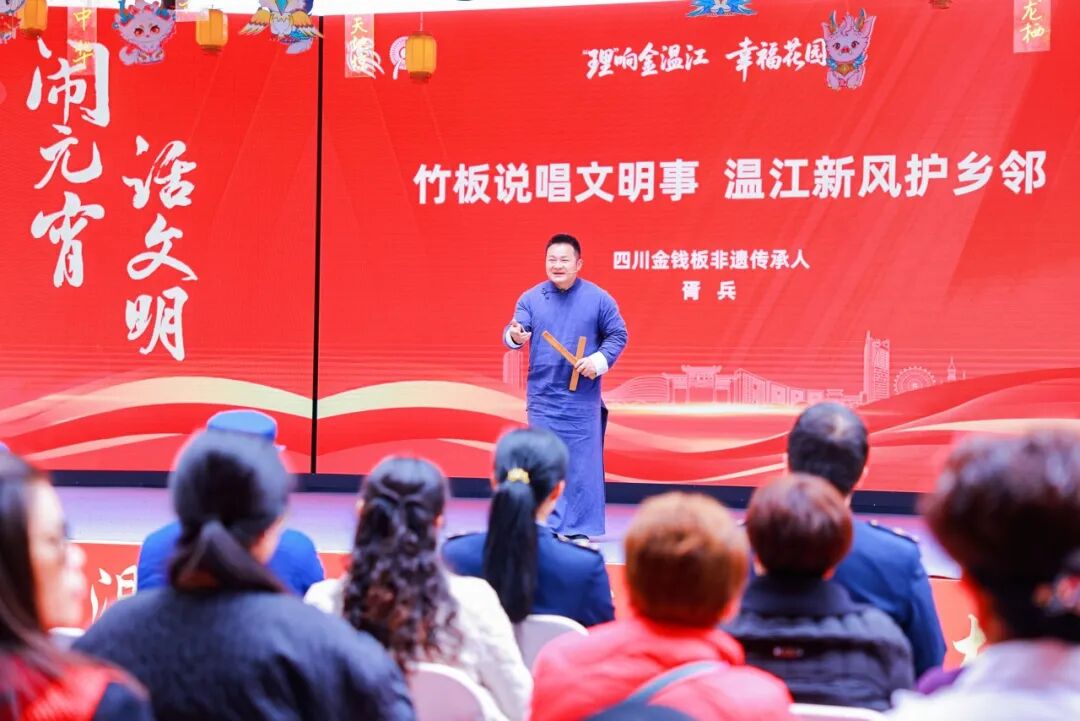 随后,四川金钱板非遗传承人胥兵通过原创节目《竹板说唱文明事》唱响文明新风尚;全国文明单位、四川航天烽火伺服控制技术有限公司工作人员赵惟仪讲述了《薪火相传》的奋斗故事;成都市党员教育市级讲师、温江区“向阳花”基层宣讲队宣讲员高长容则将元宵民俗与雷锋精神相结合,在互动问答中引导群众感悟传统文化与时代精神的交融。